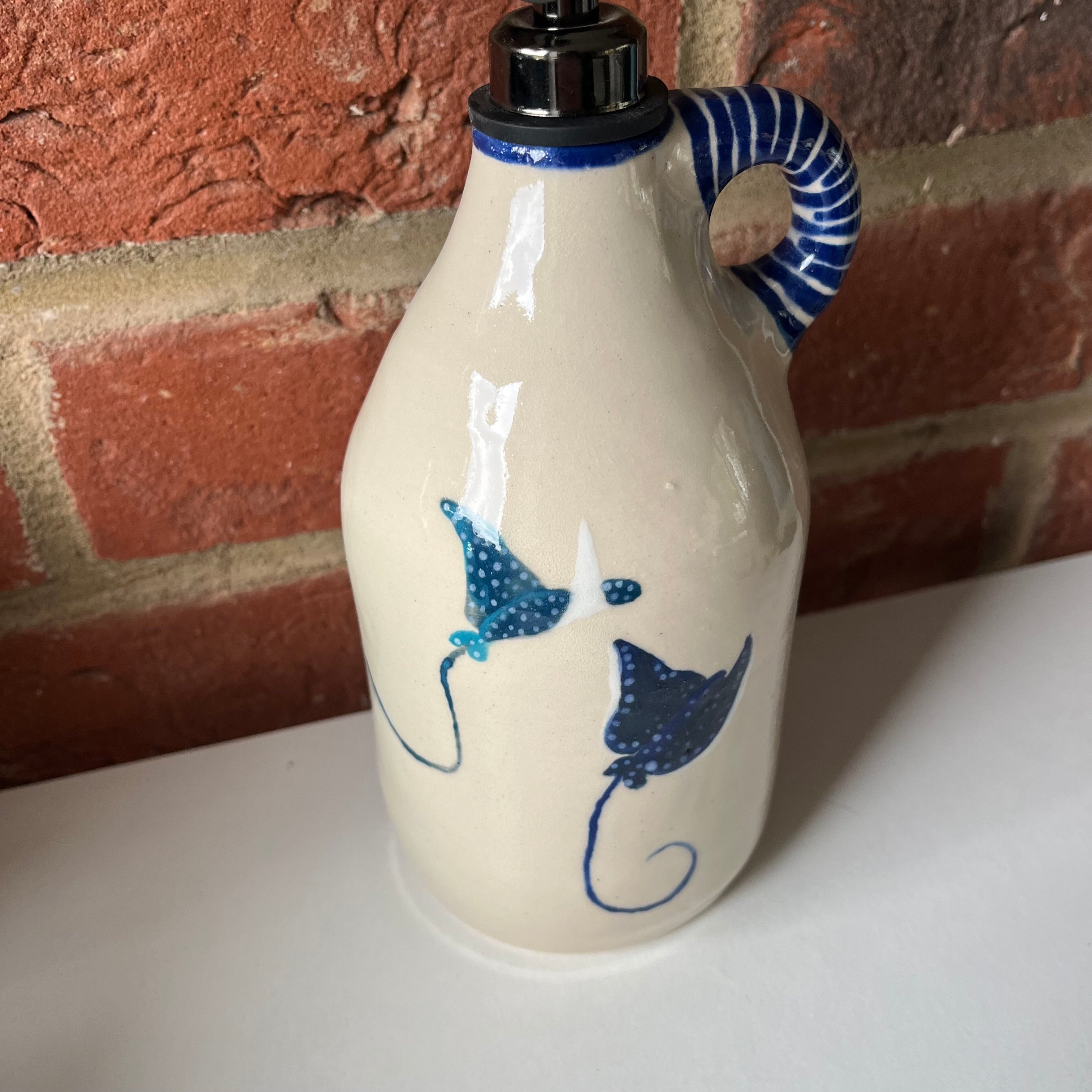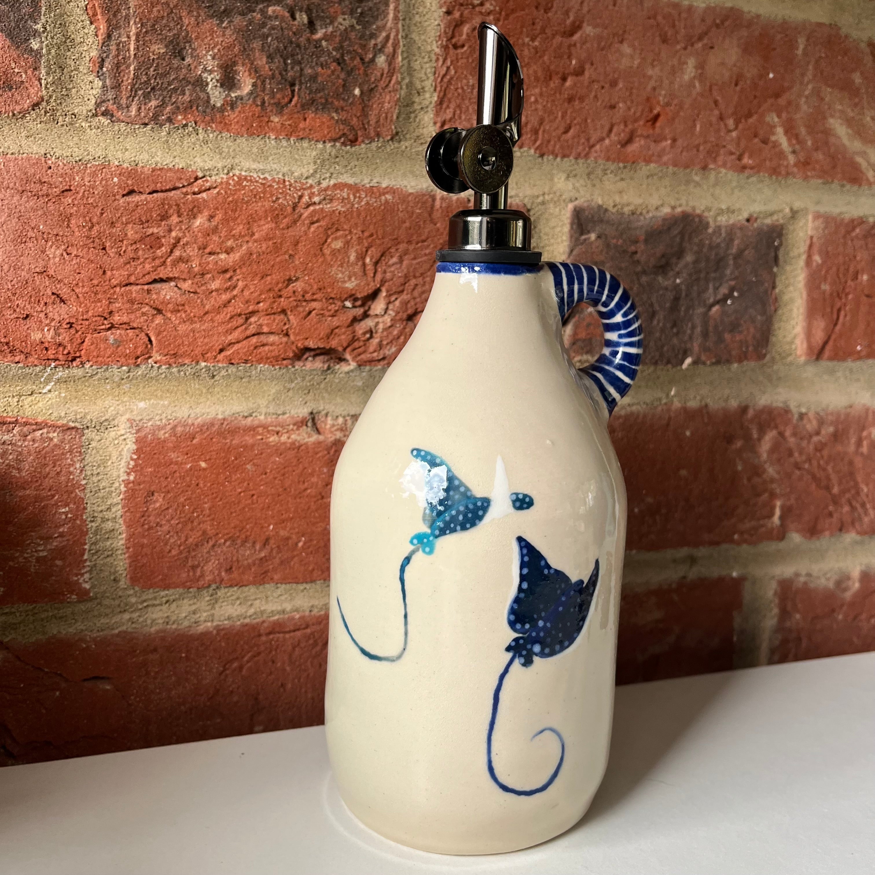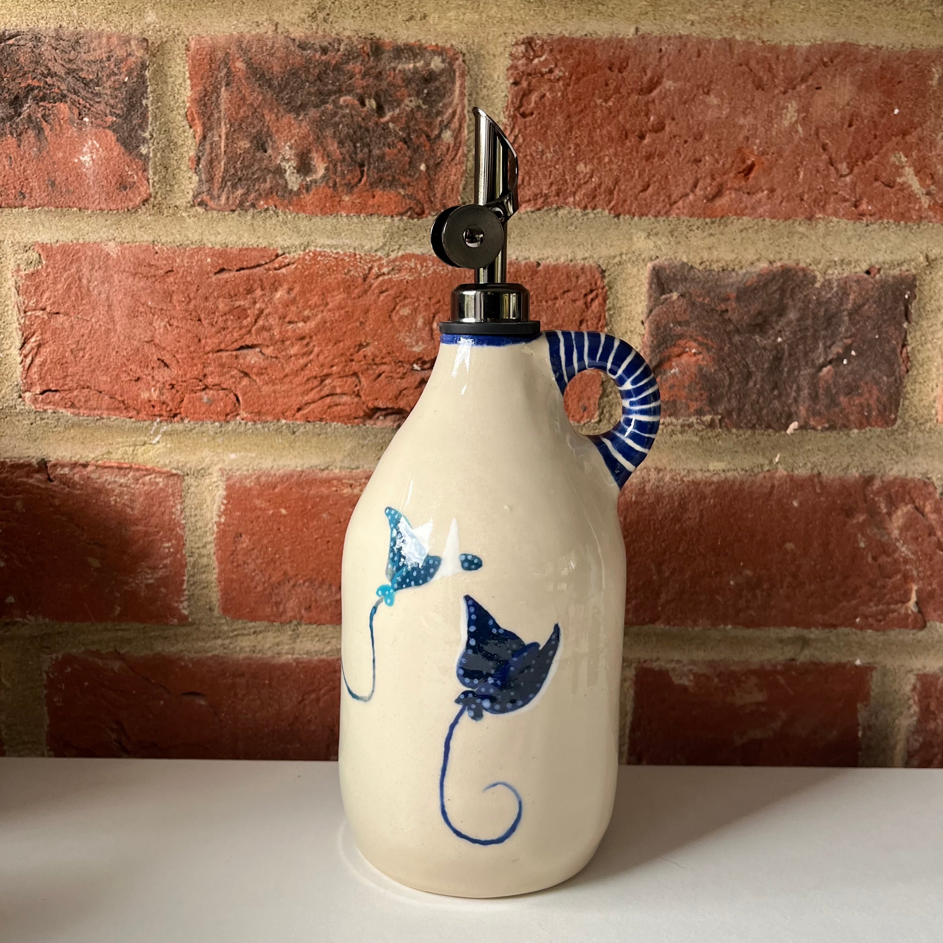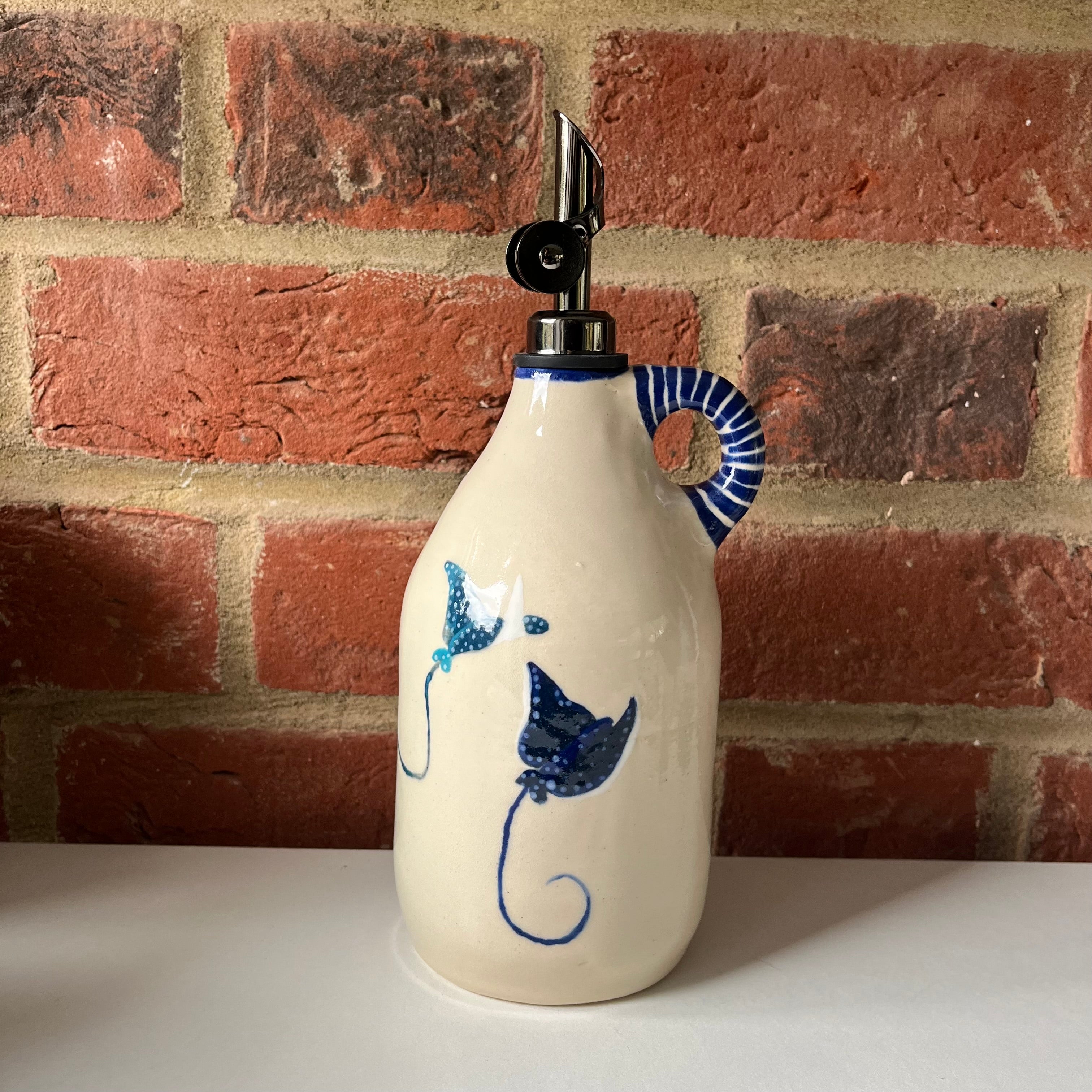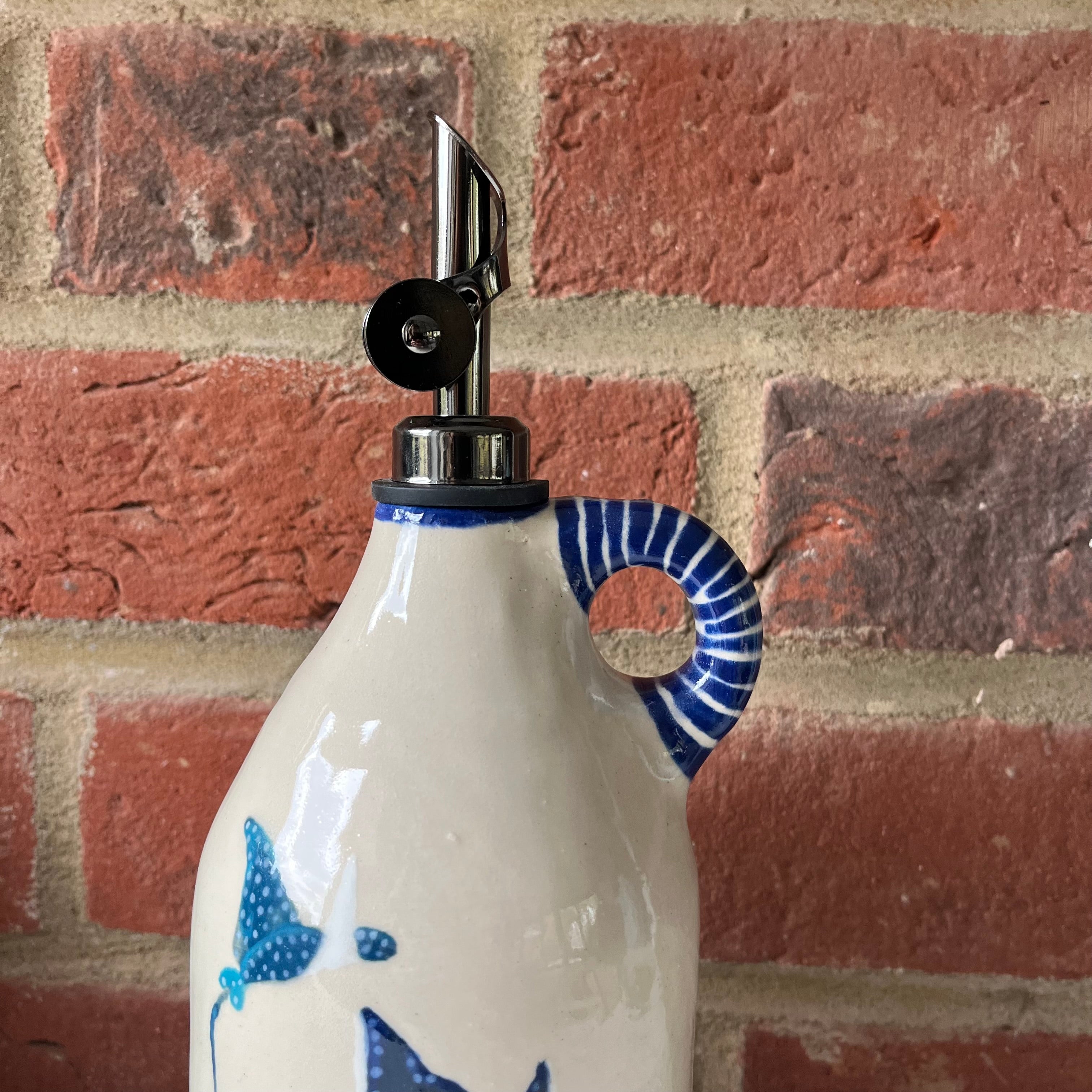 A large oil pourer handmade on the wheel by Olivia and mouth painted by Emily.