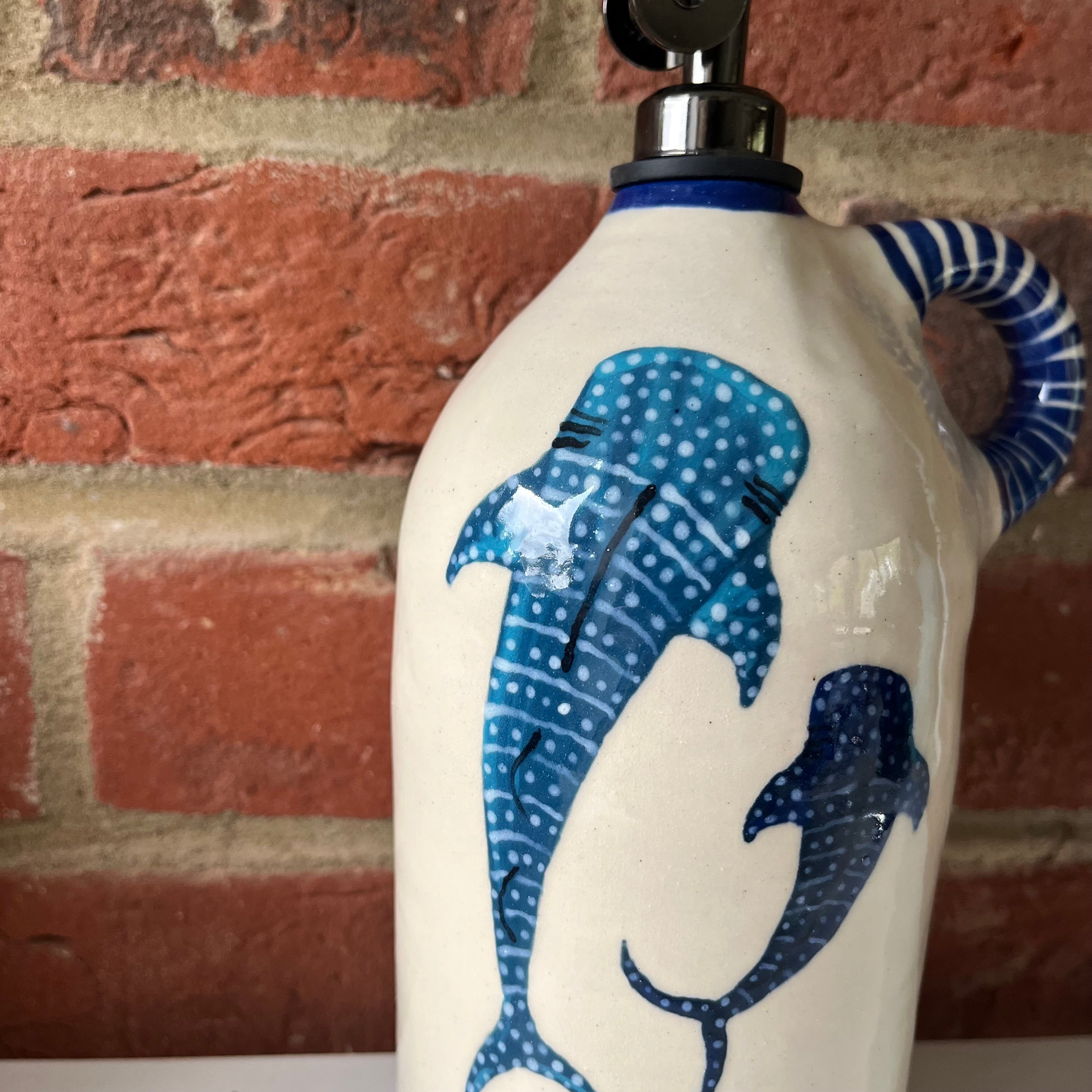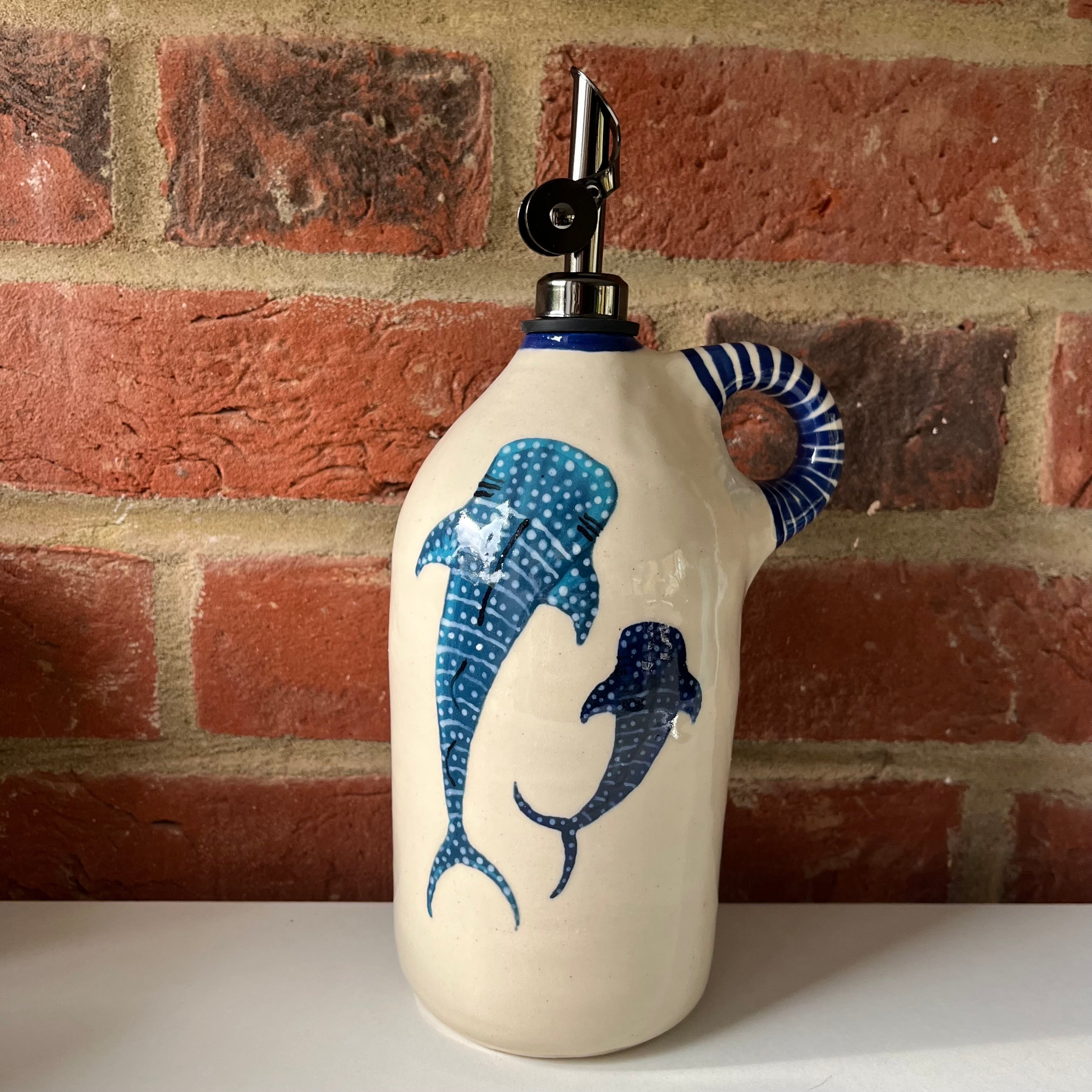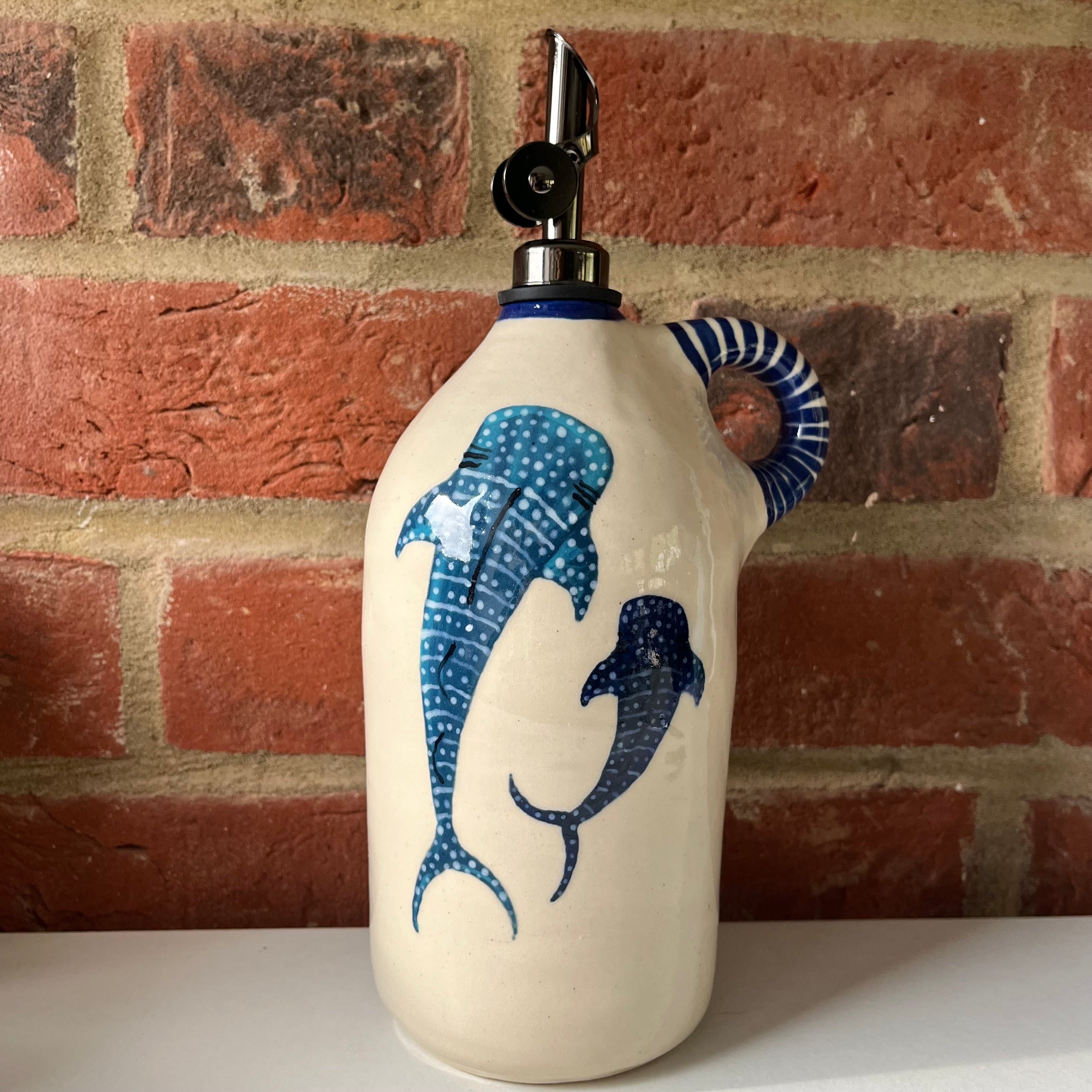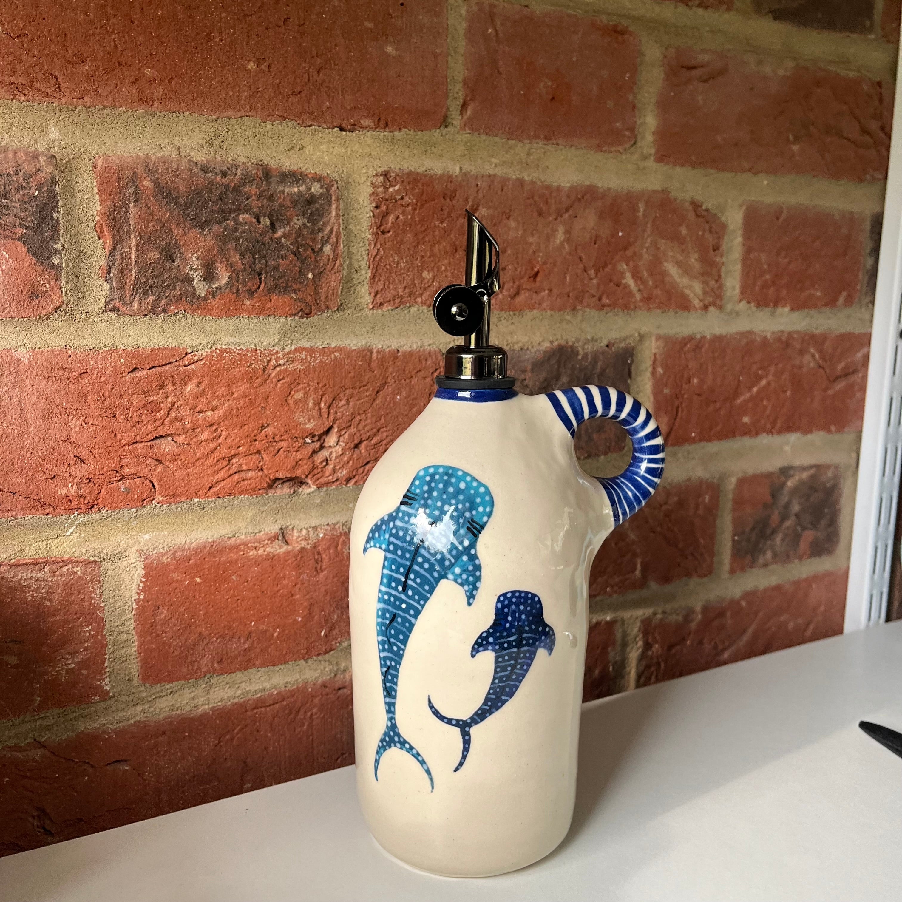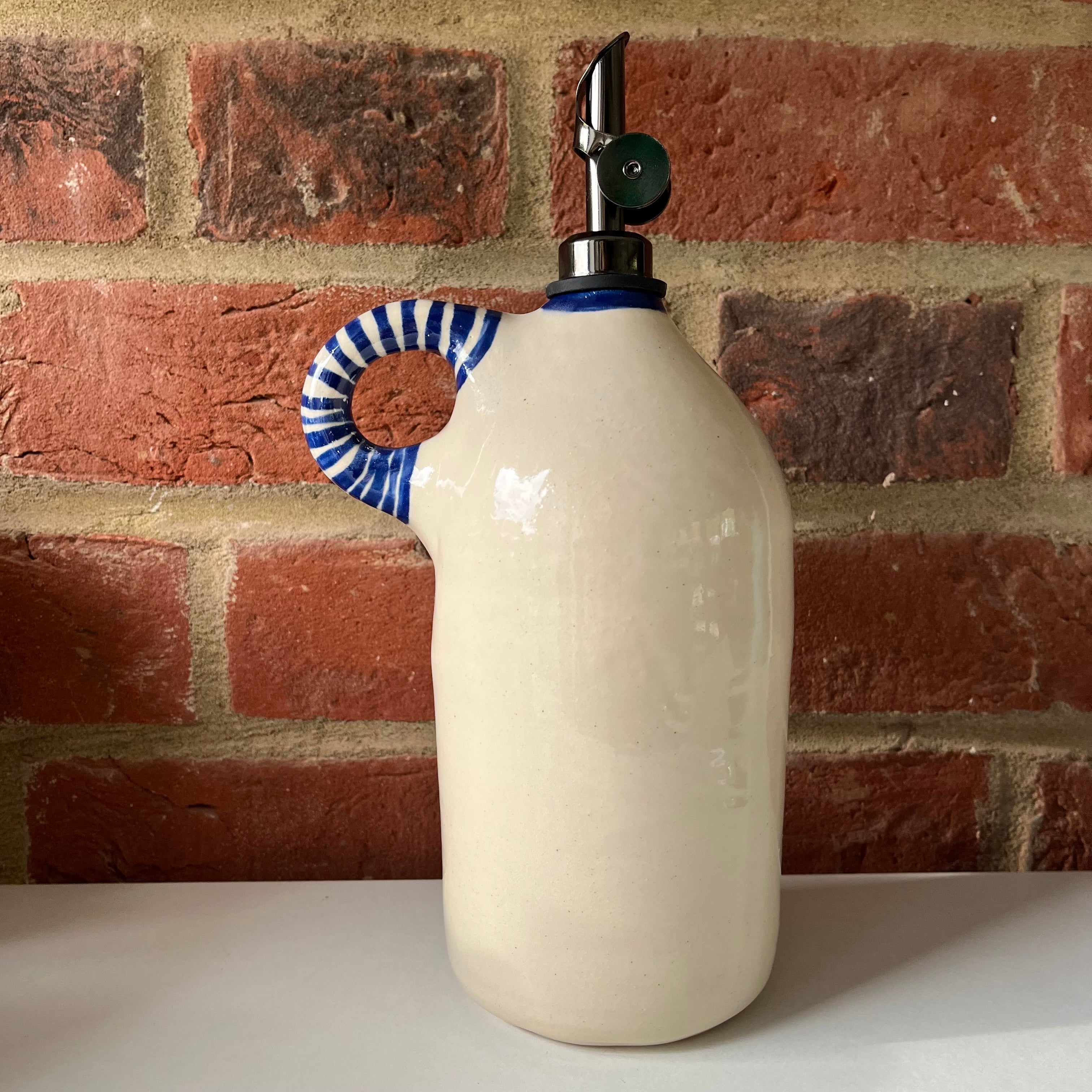 A large oil pourer handmade on the wheel by Olivia and mouth painted by Emily.
