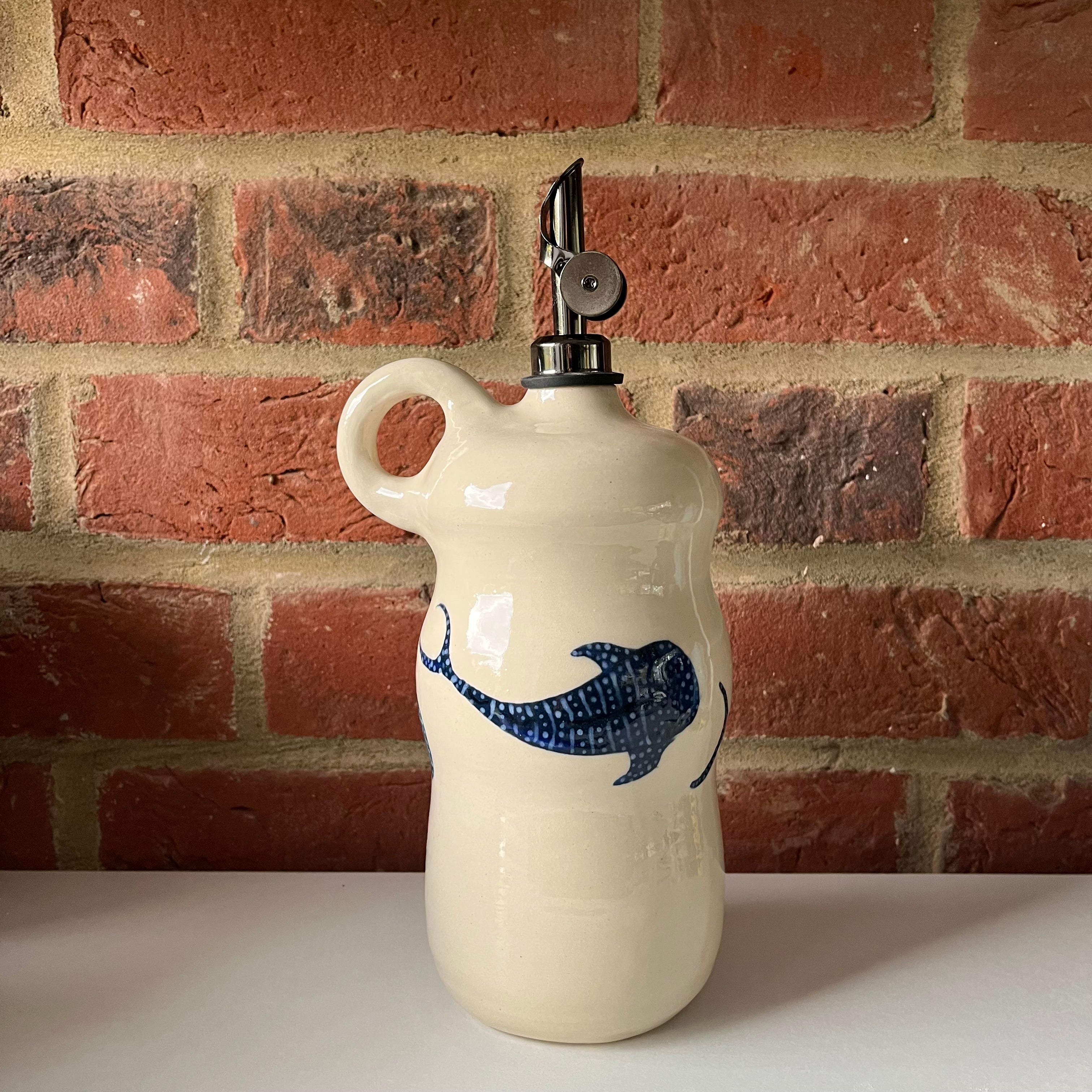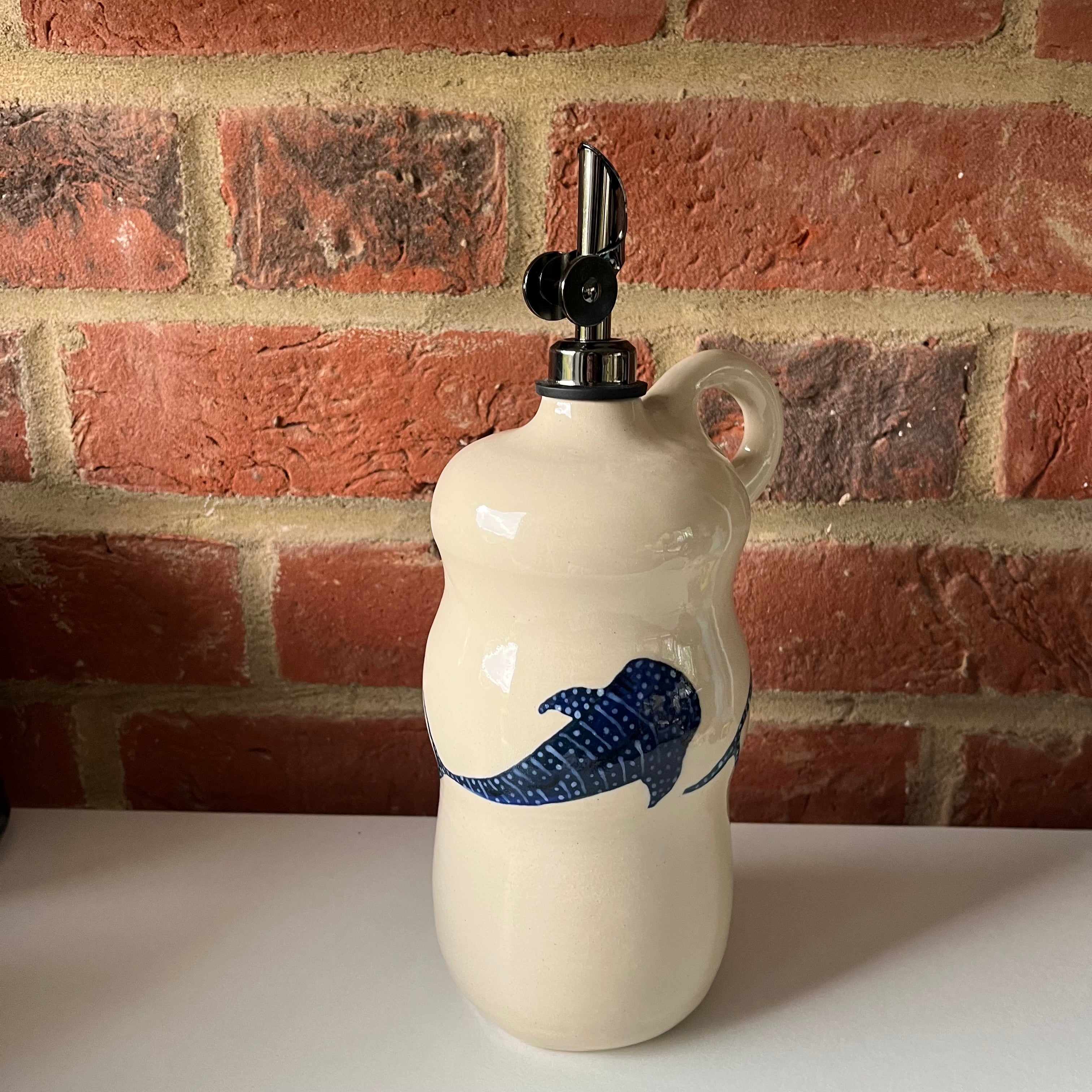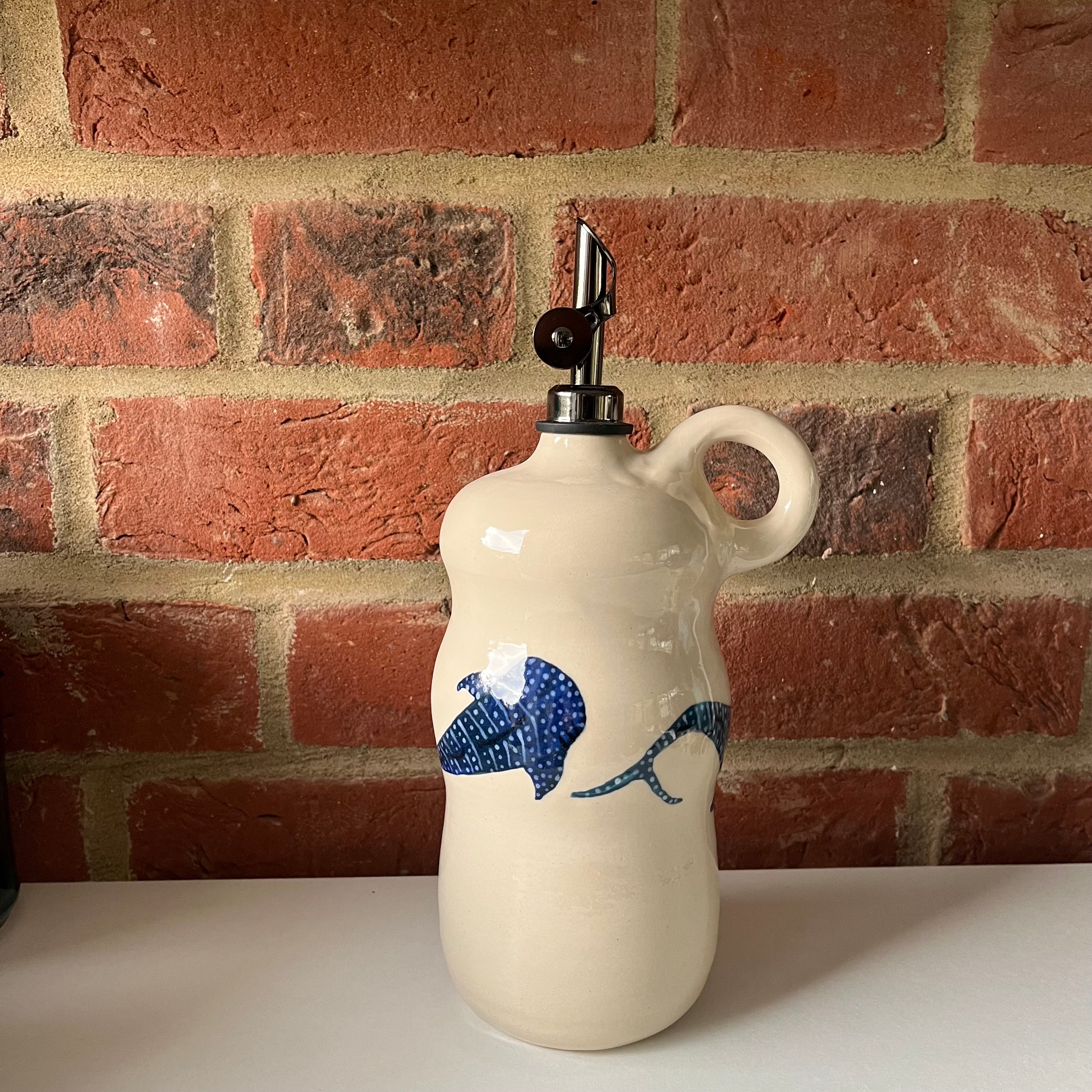 A large oil pourer handmade on the wheel by Olivia and mouth painted by Emily.