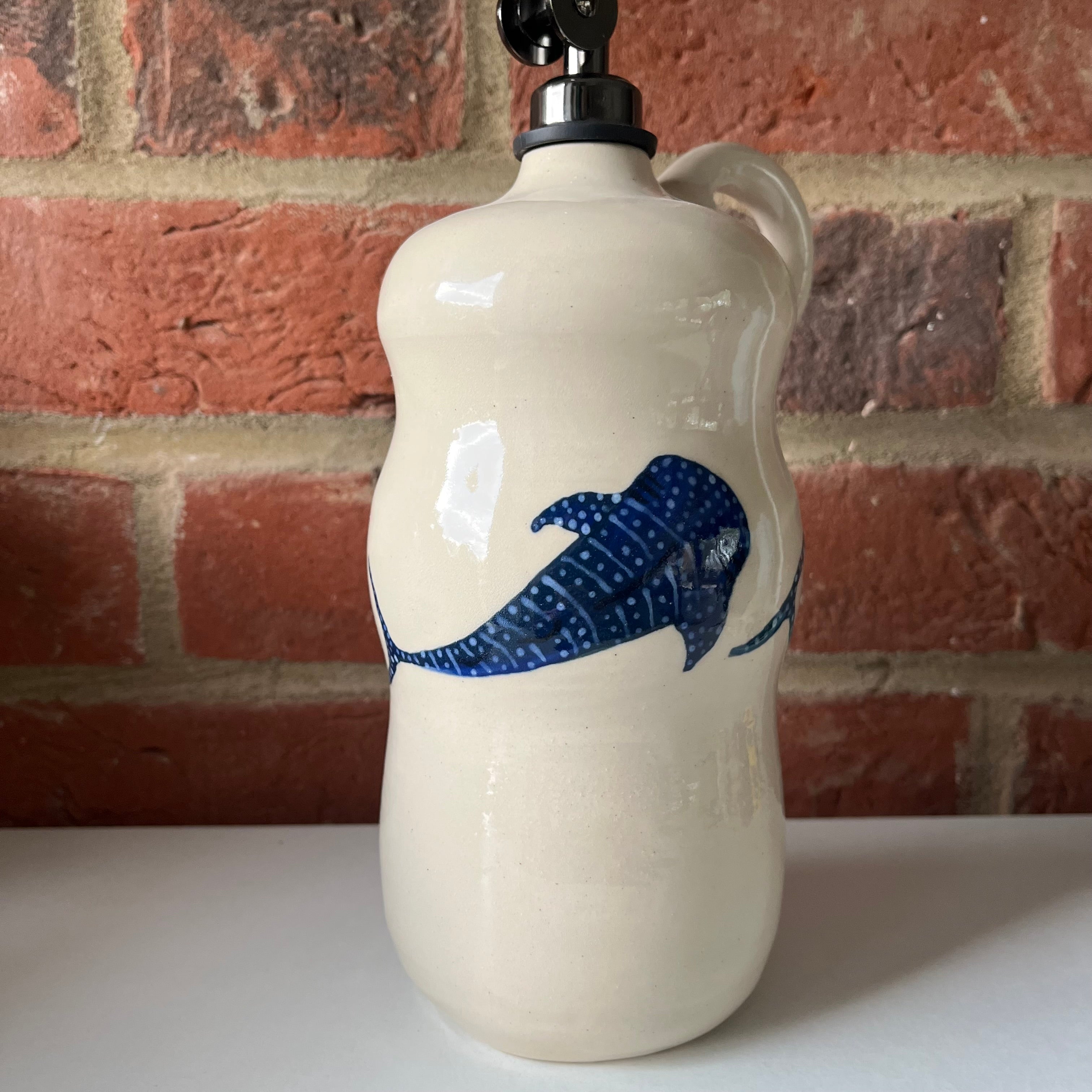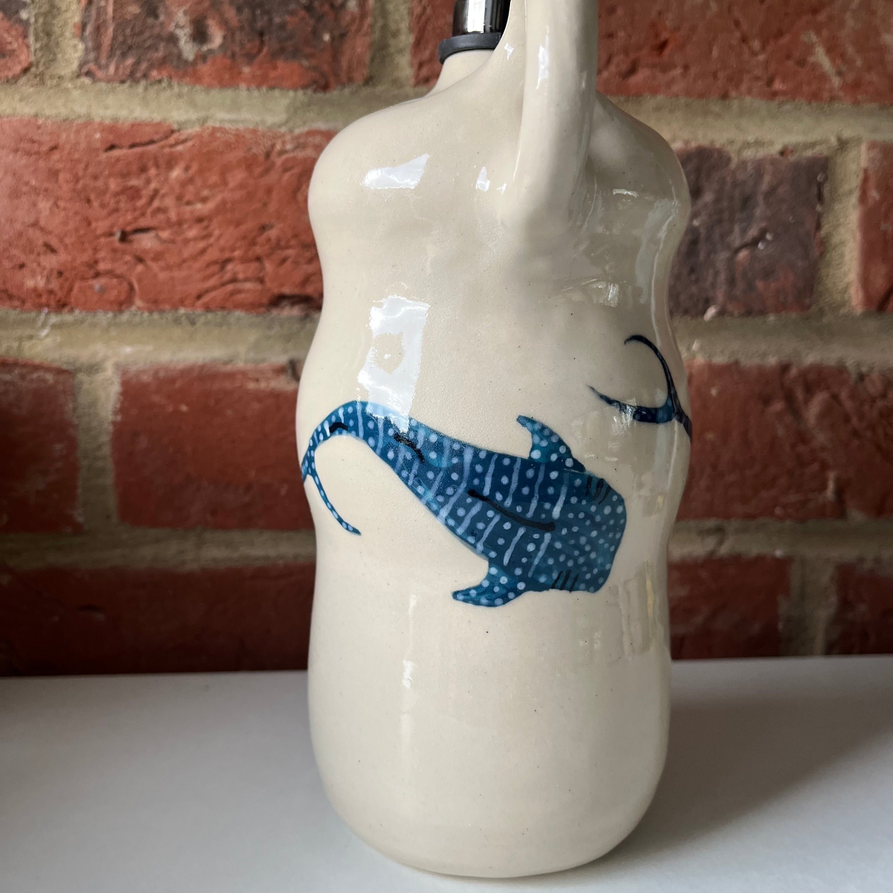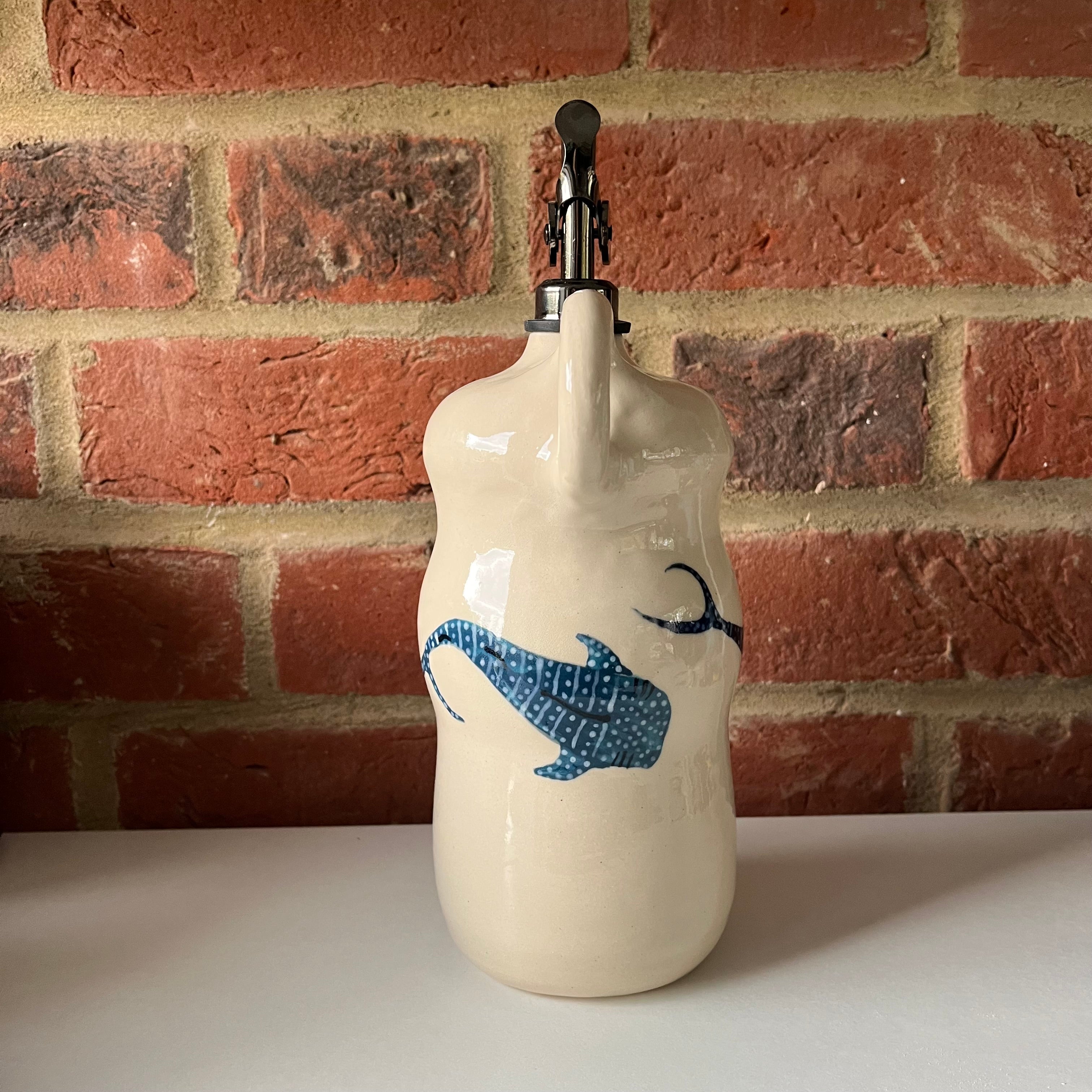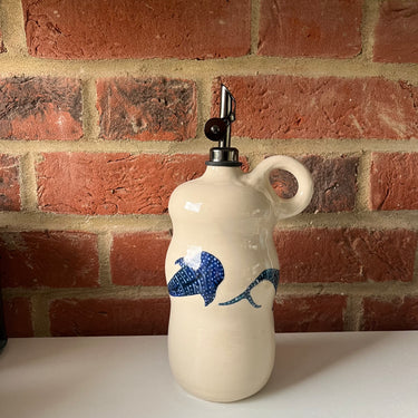 A large oil pourer handmade on the wheel by Olivia and mouth painted by Emily.