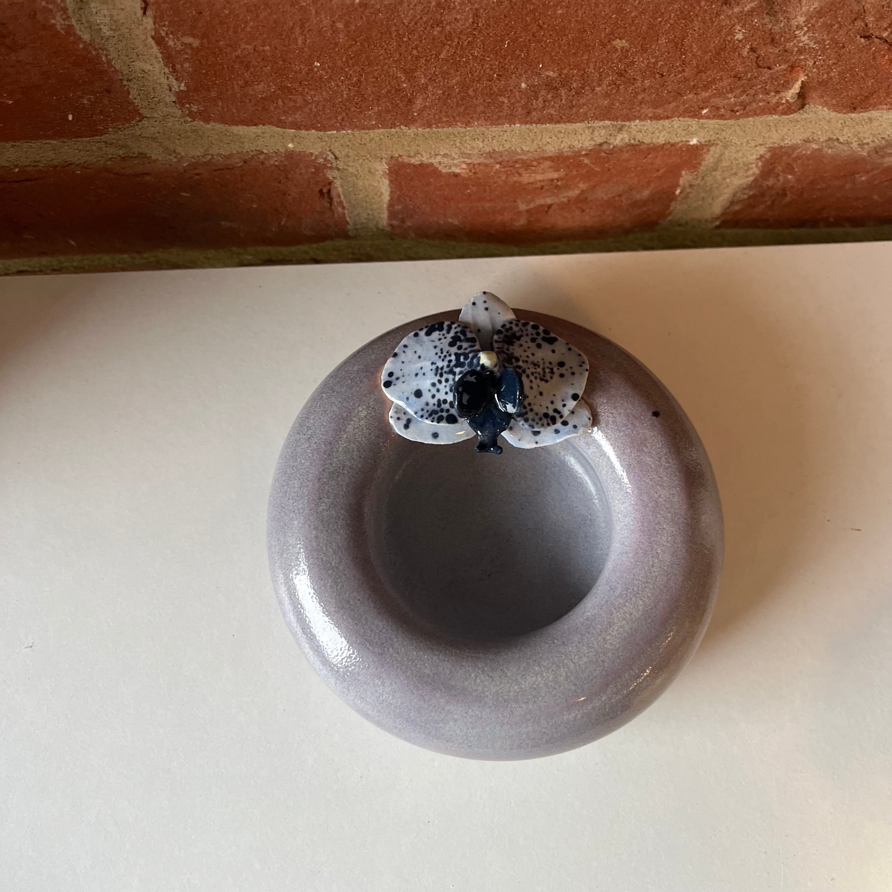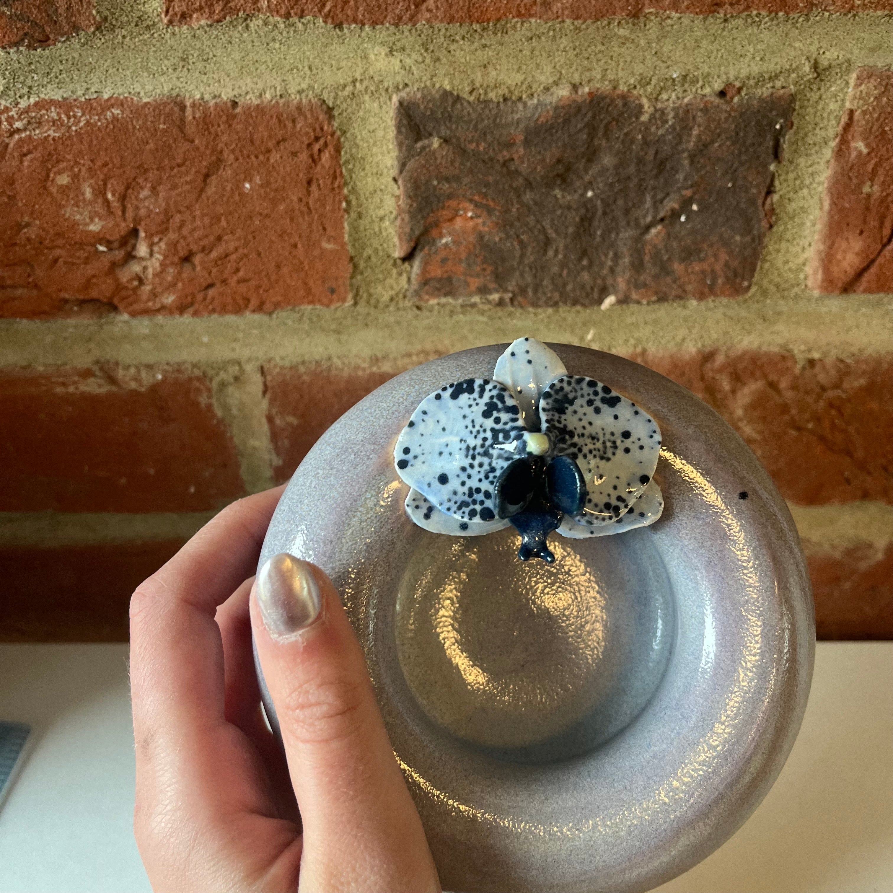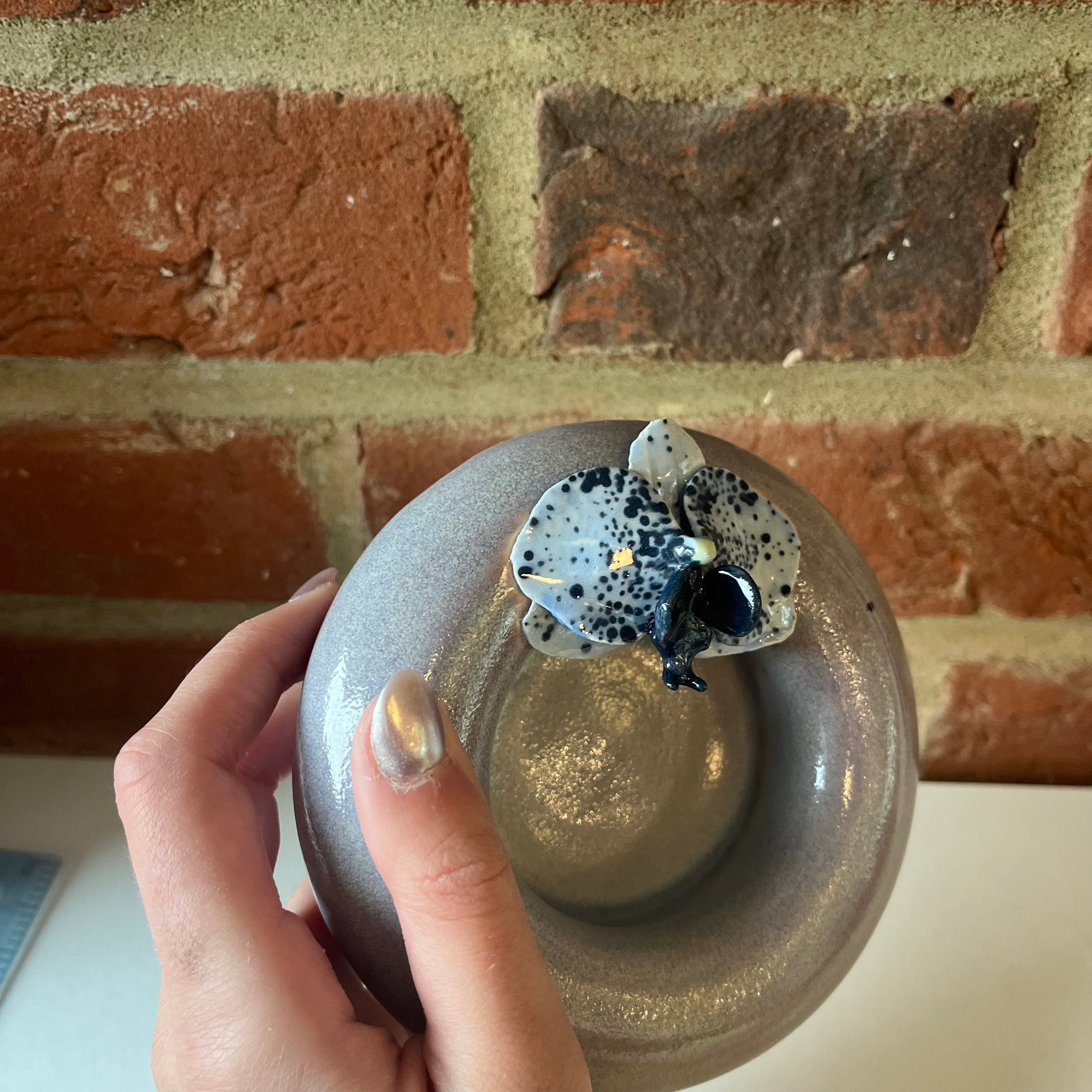 A handmade orchid made by Olivia and placed onto a stoneware dish, also thrown by Olivia.