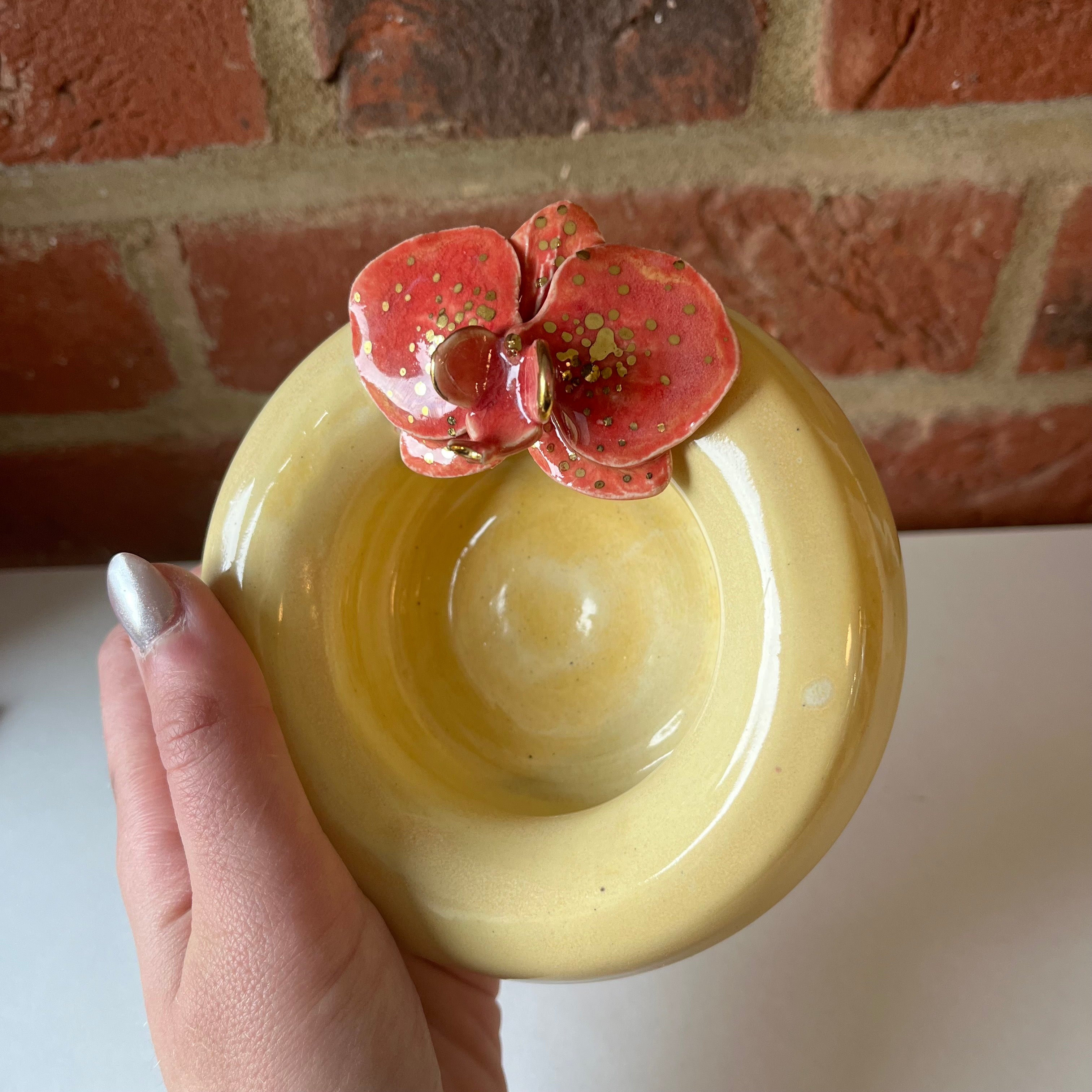 A handmade orchid made by Olivia and placed onto a stoneware dish, also thrown by Olivia.