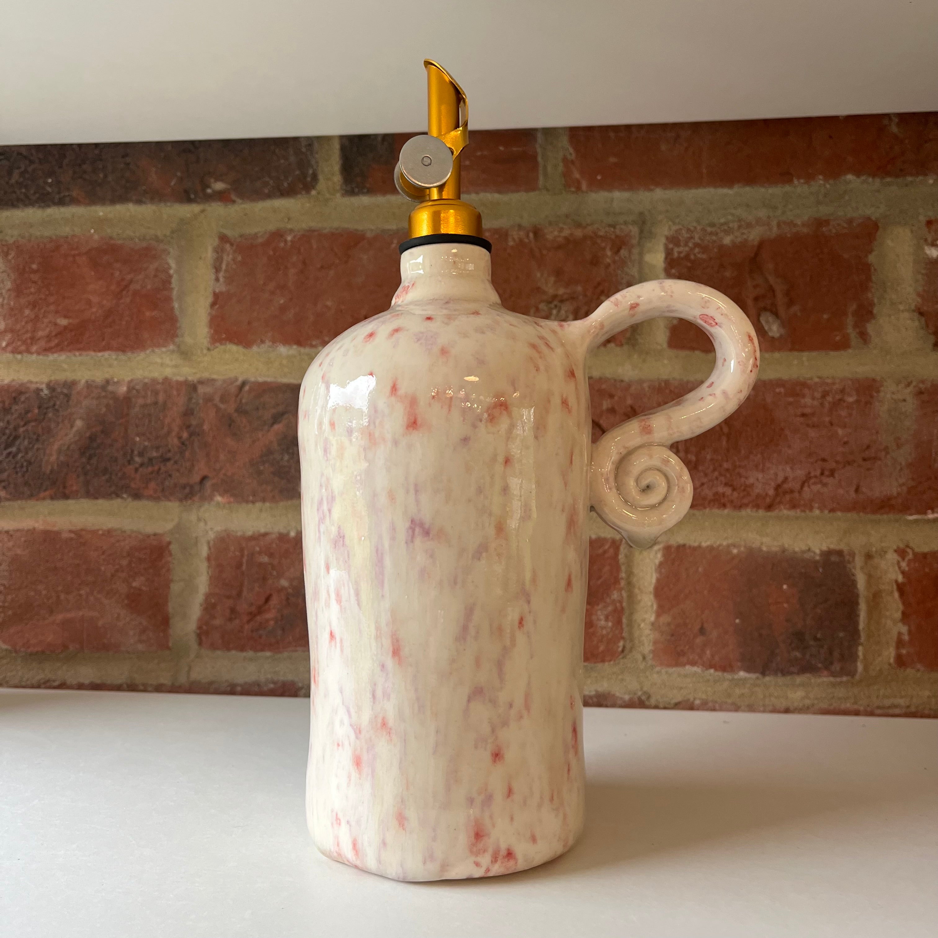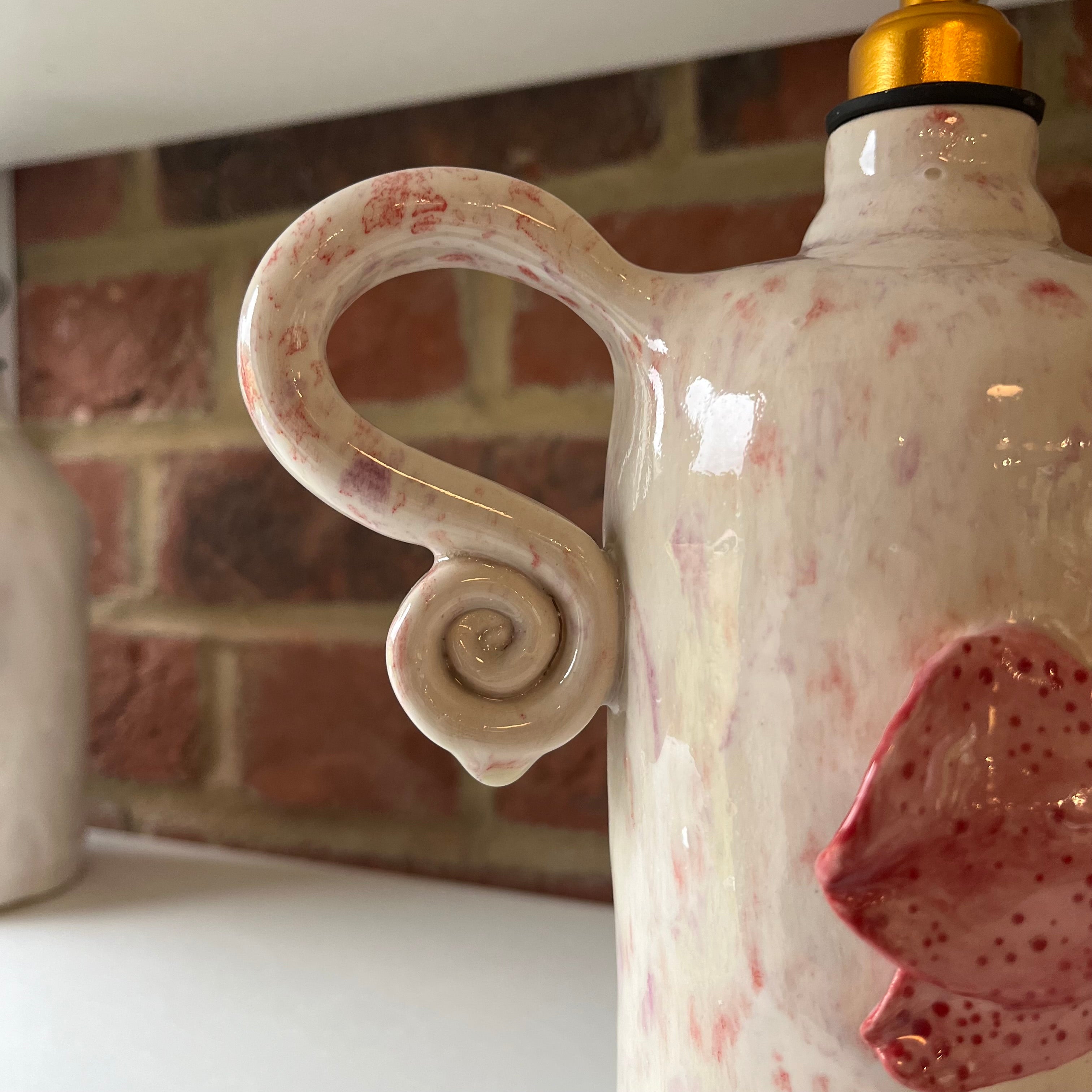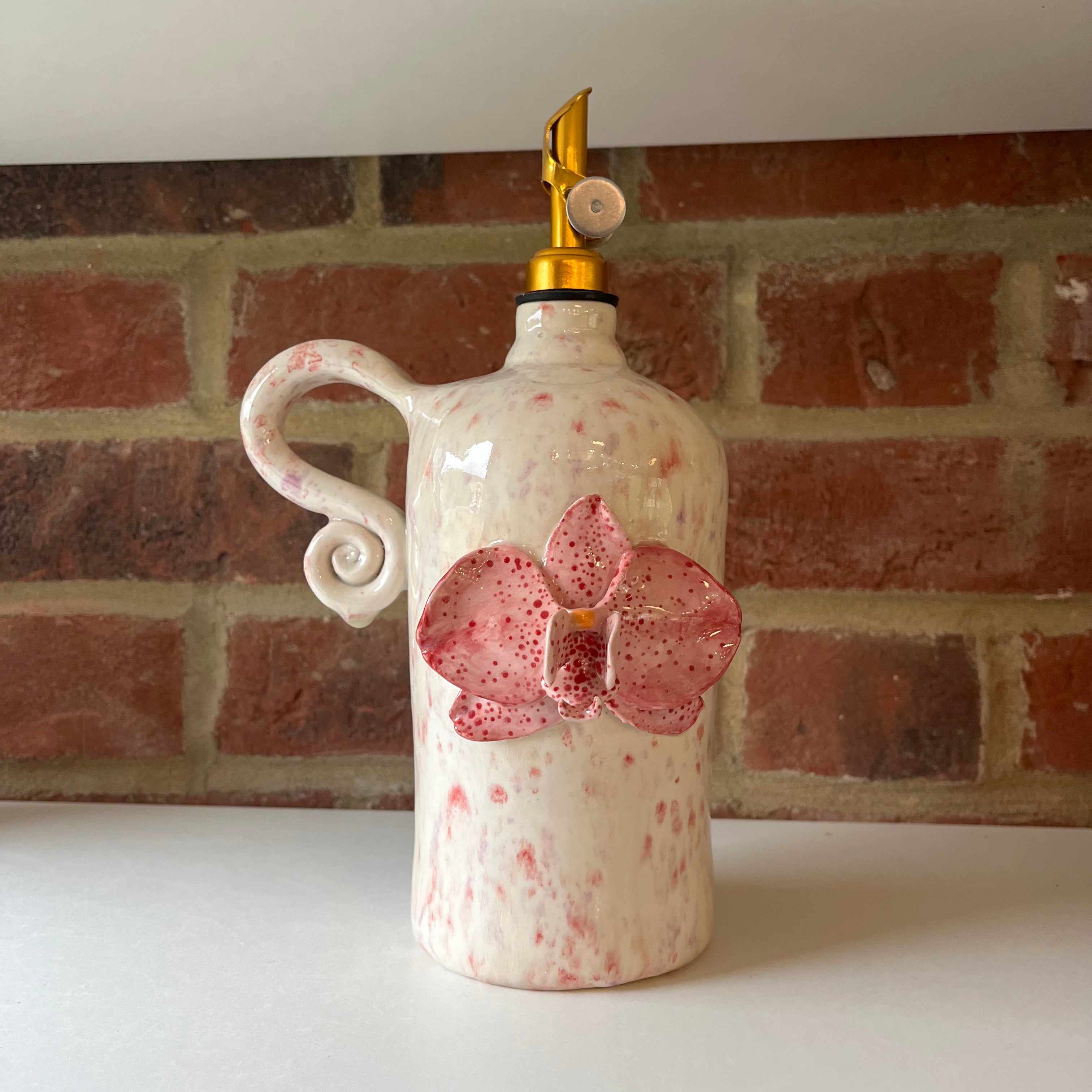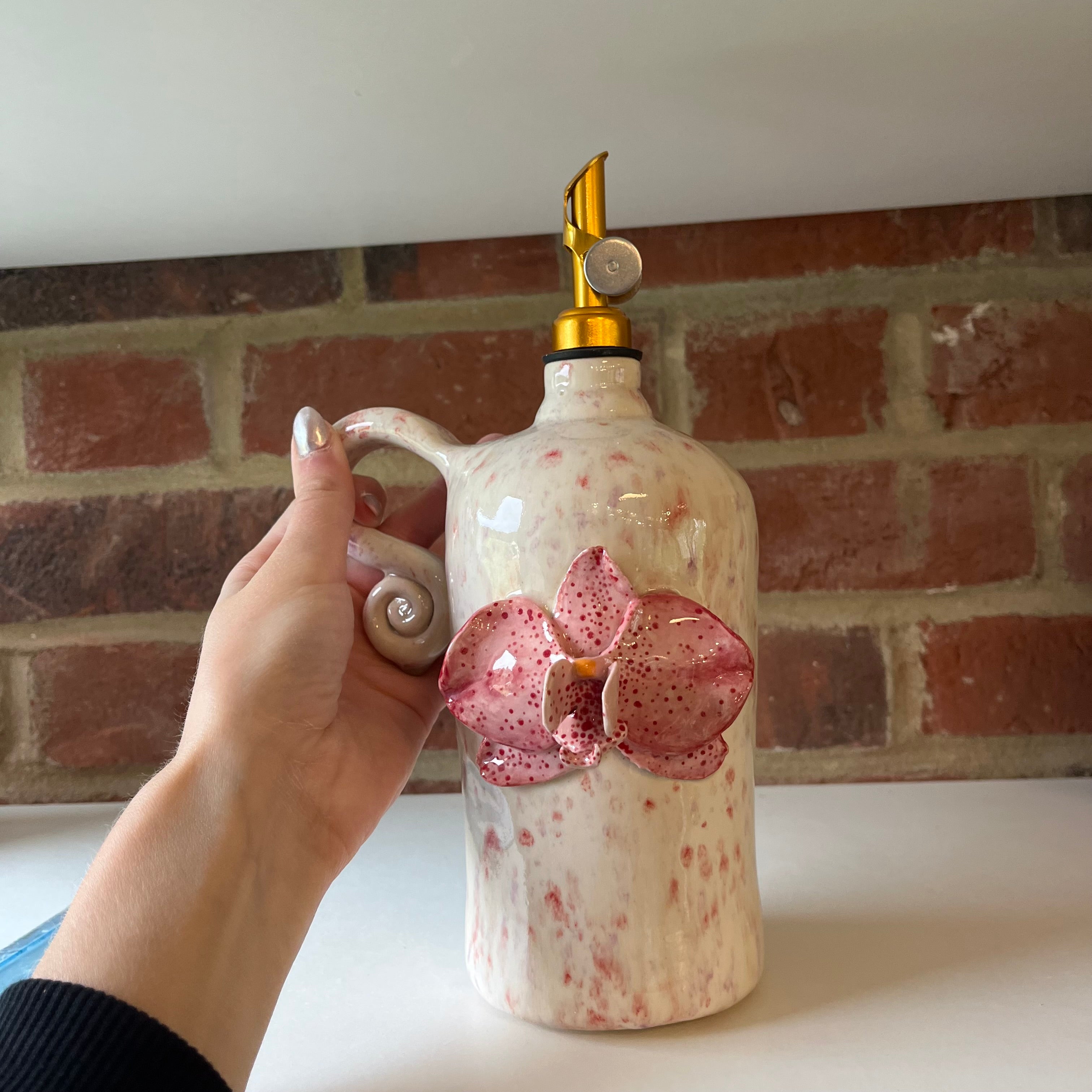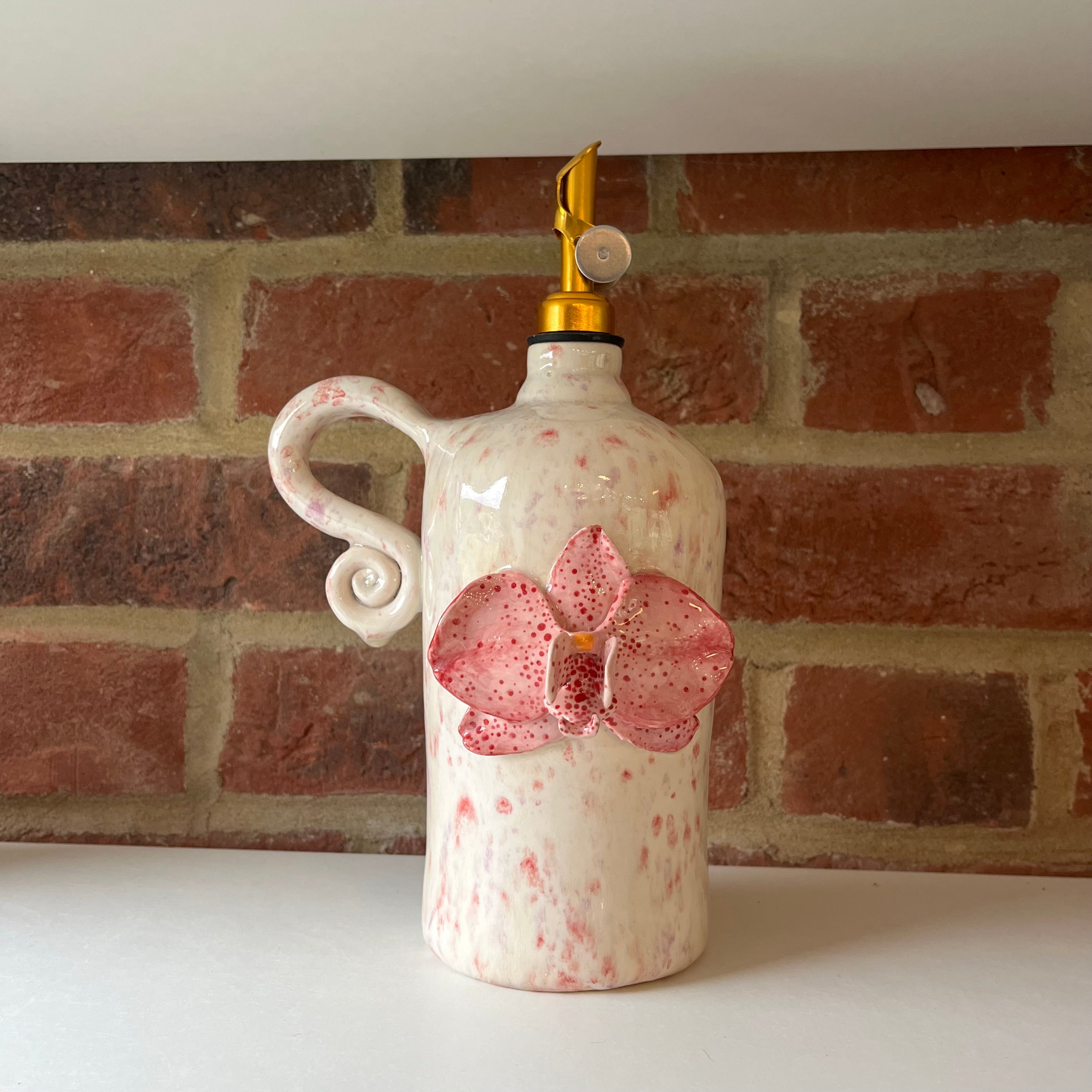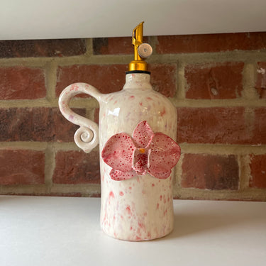 A handmade orchid made by Olivia and placed onto a stoneware oil pourer, also thrown by Olivia.
