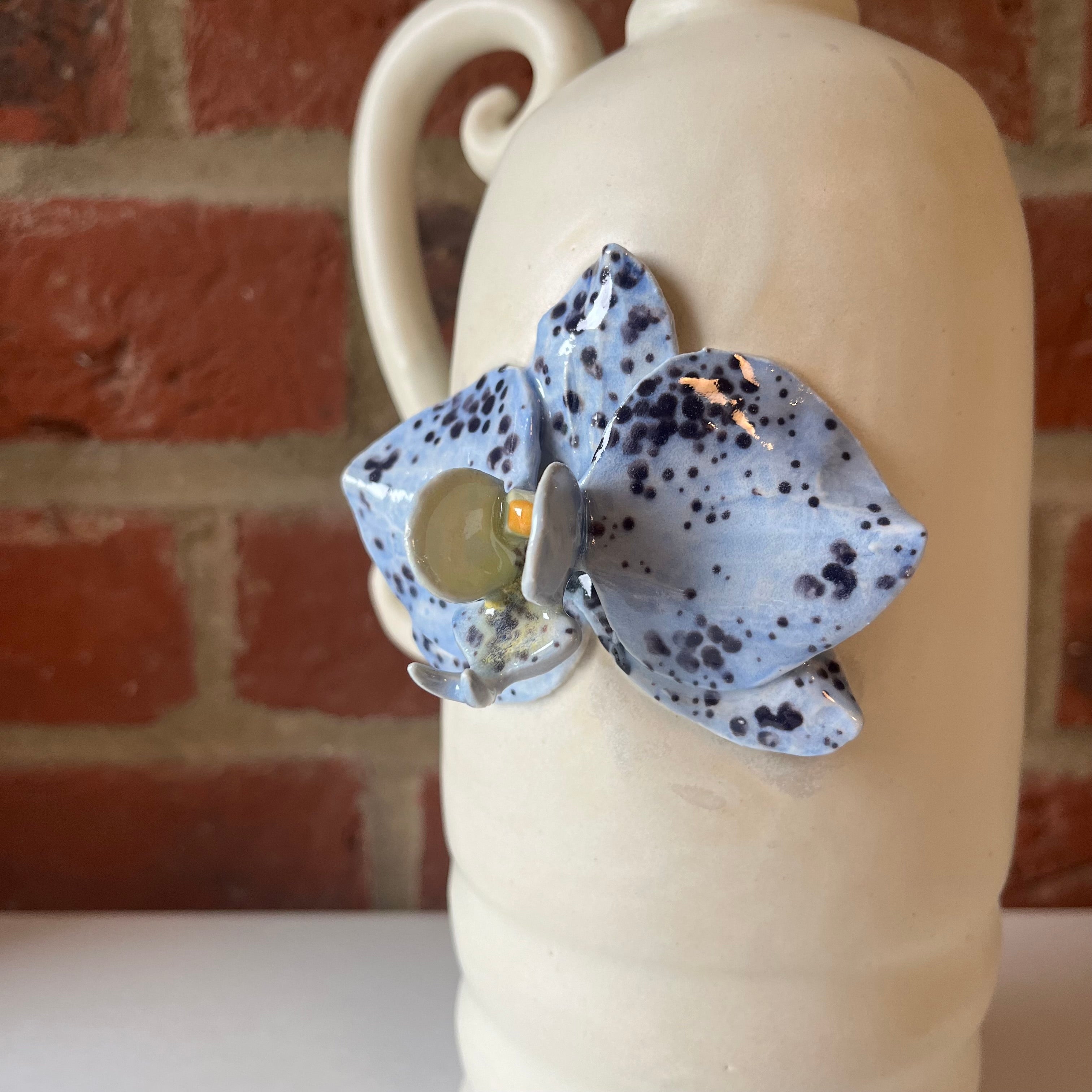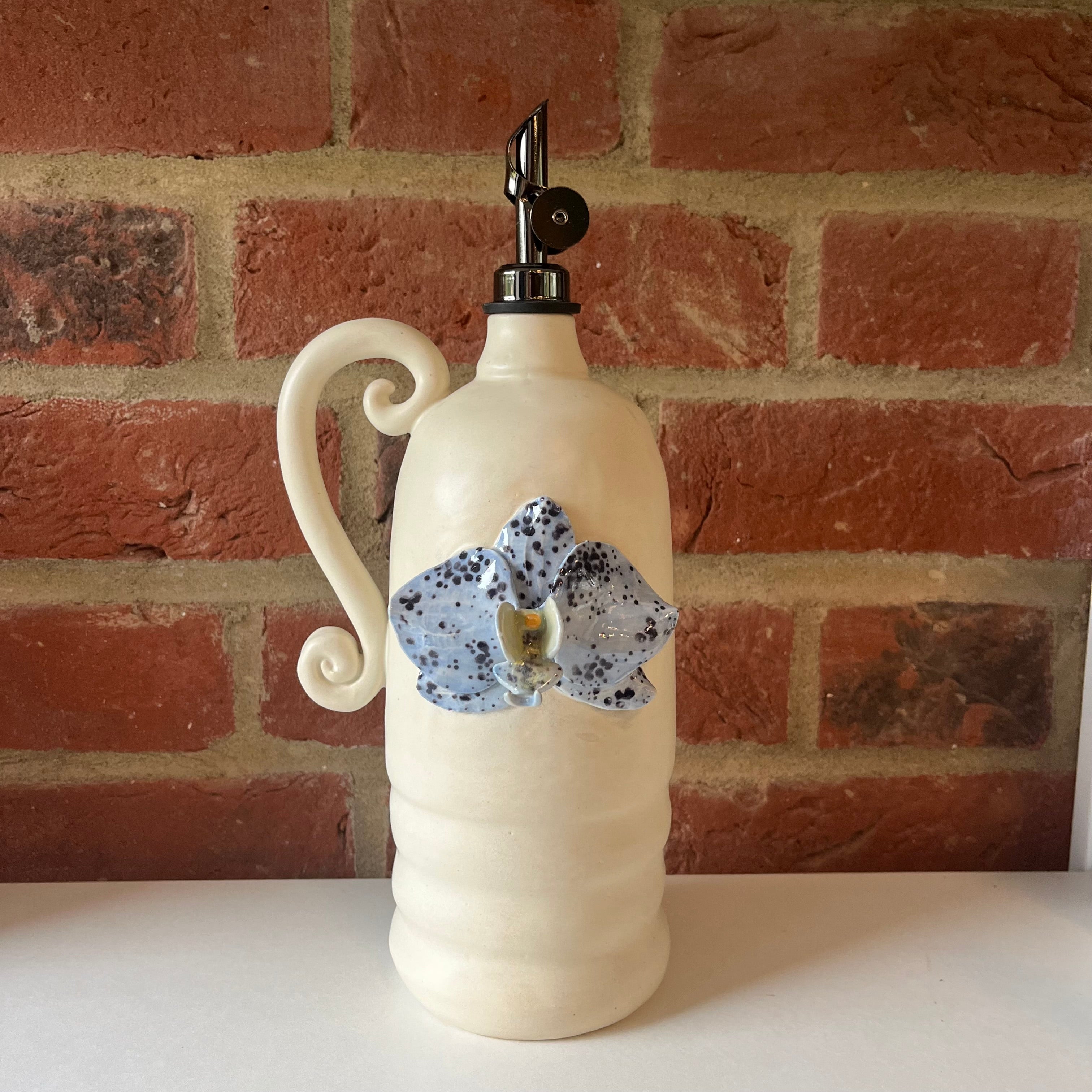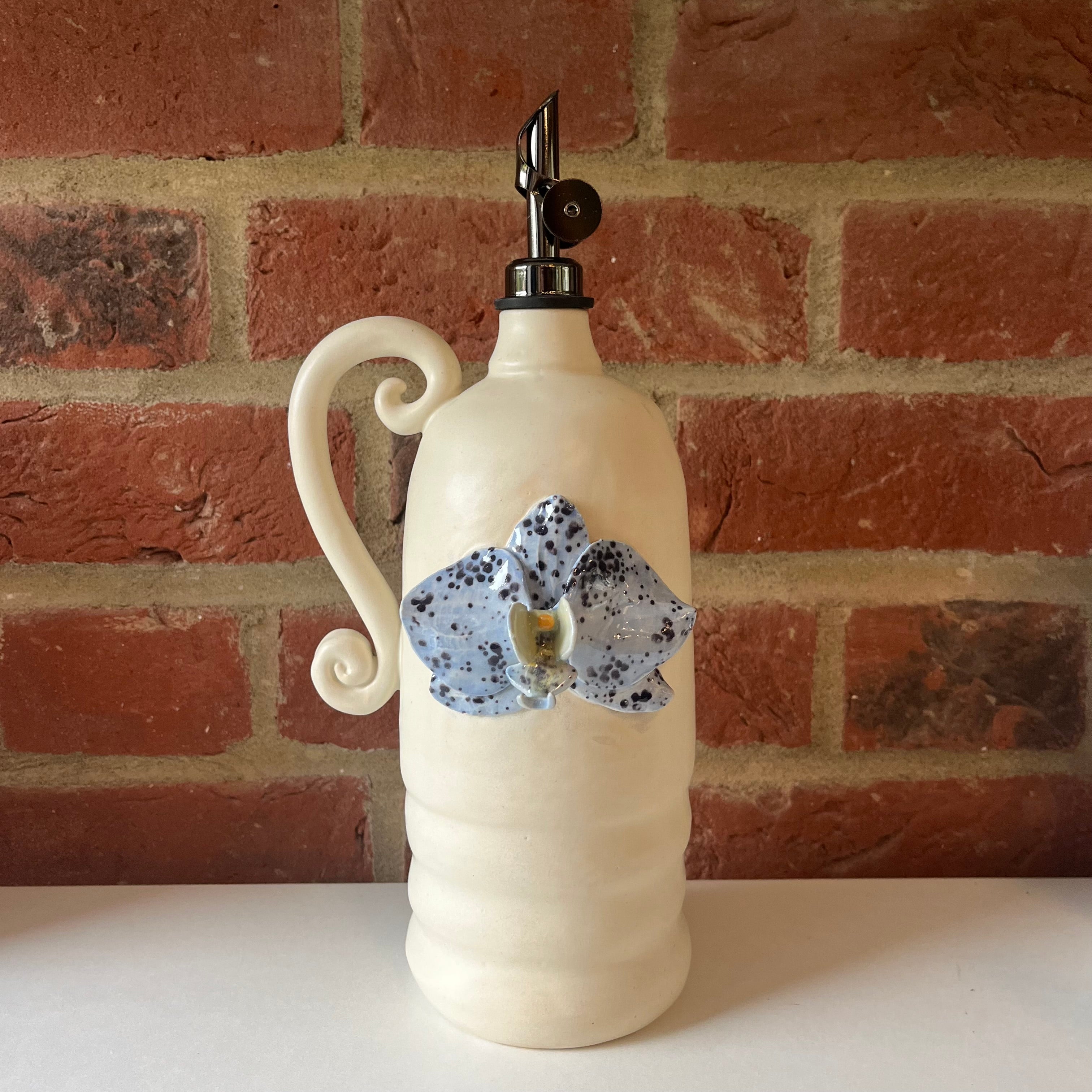 A handmade orchid made by Olivia and placed onto a stoneware oil pourer, also thrown by Olivia.
