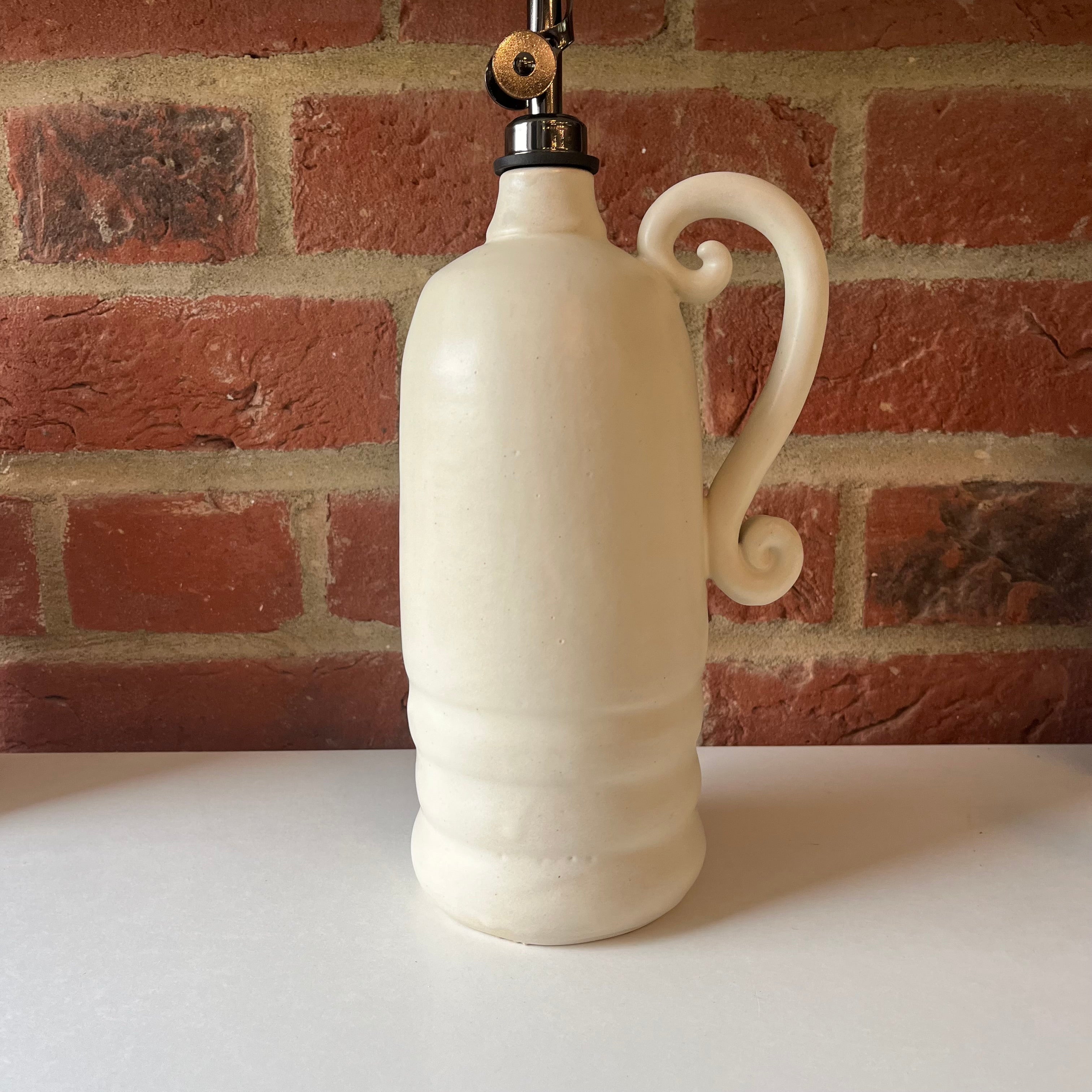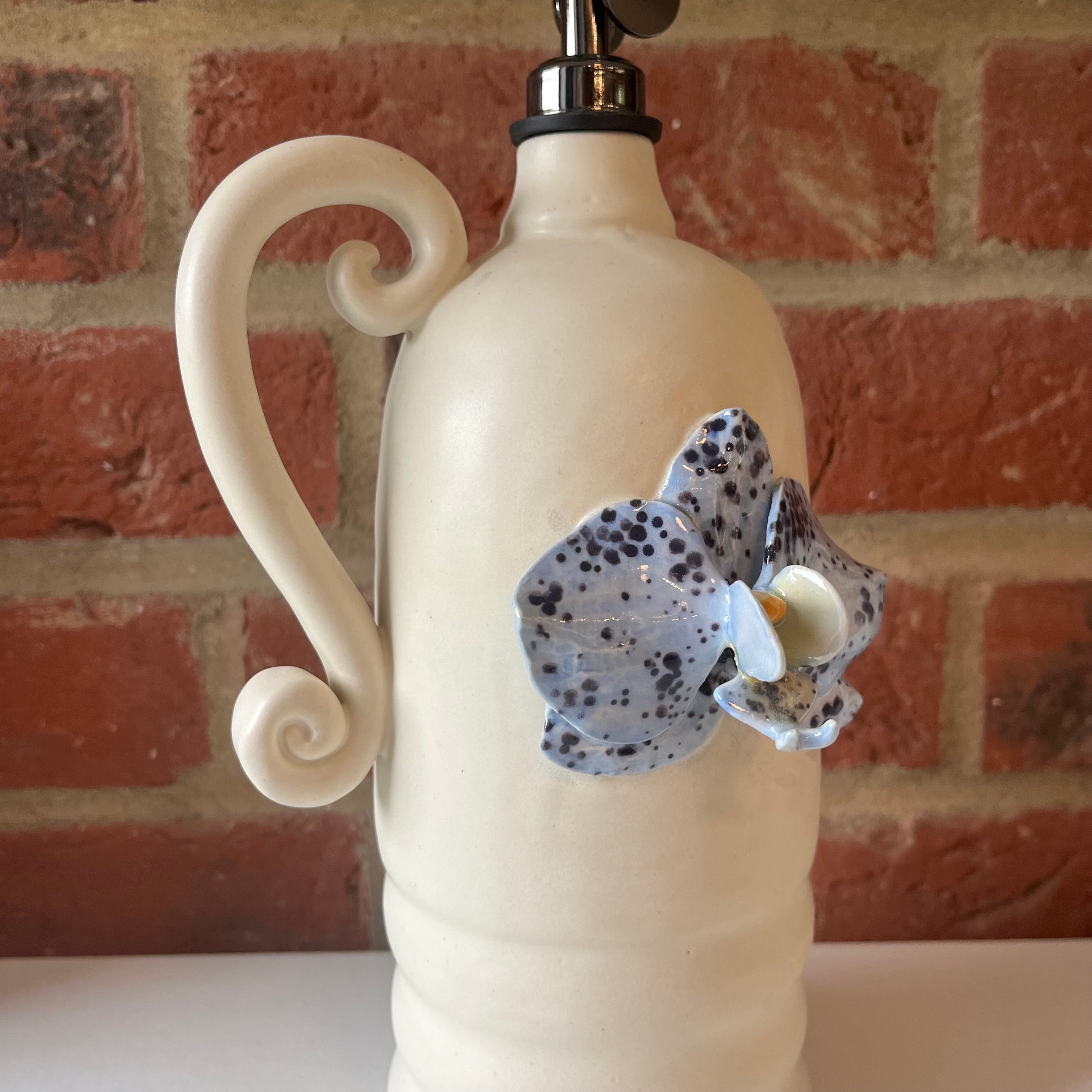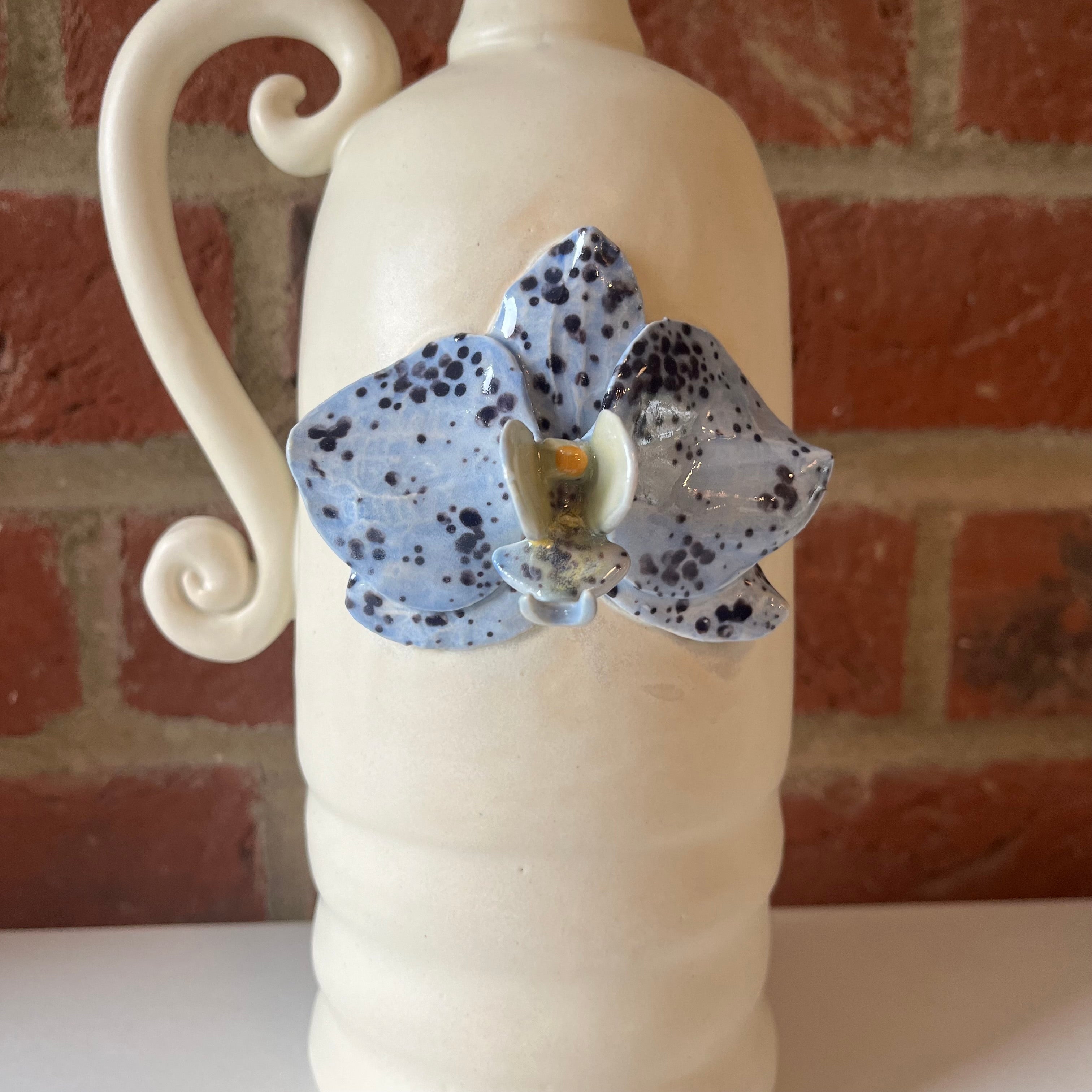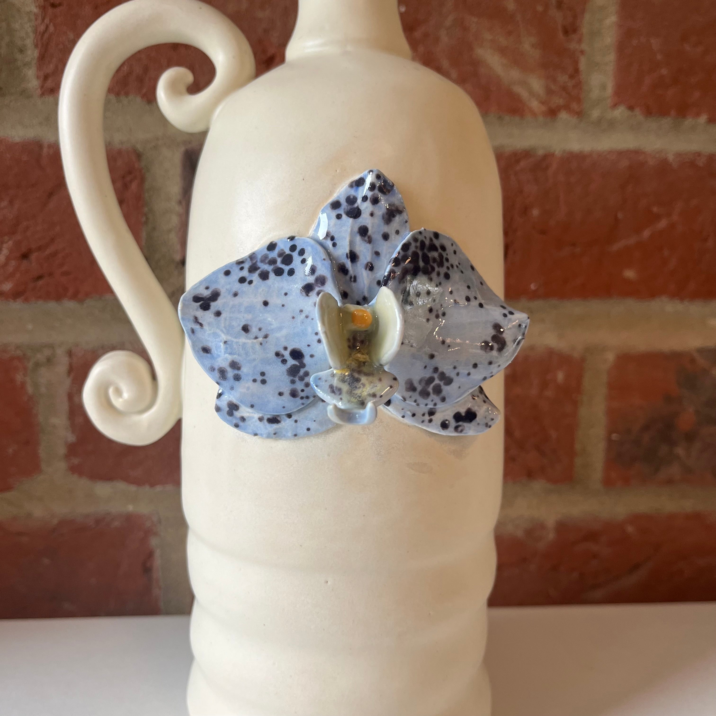 A handmade orchid made by Olivia and placed onto a stoneware oil pourer, also thrown by Olivia.