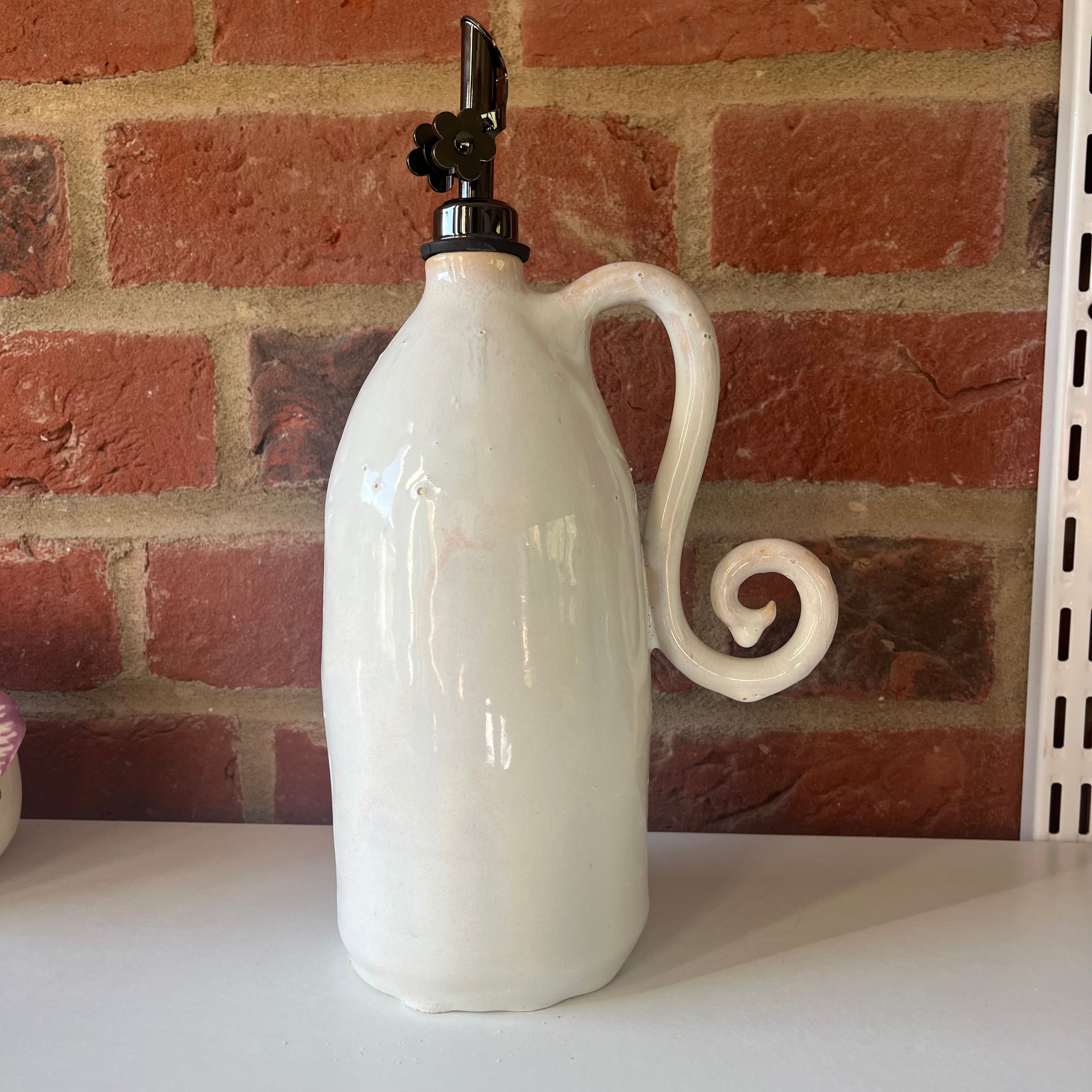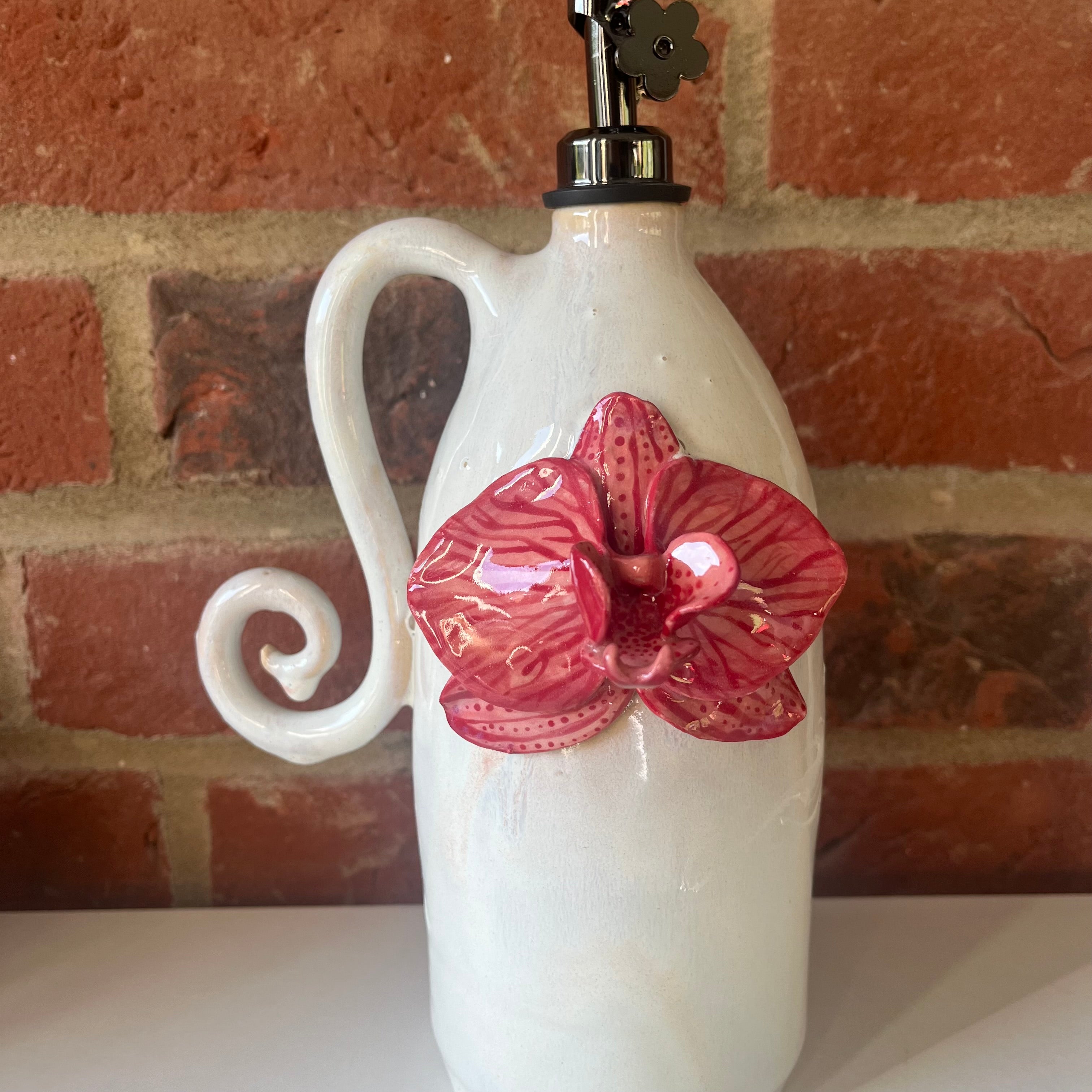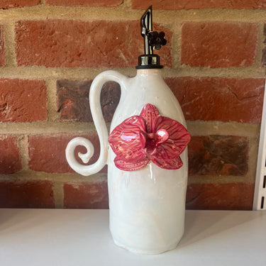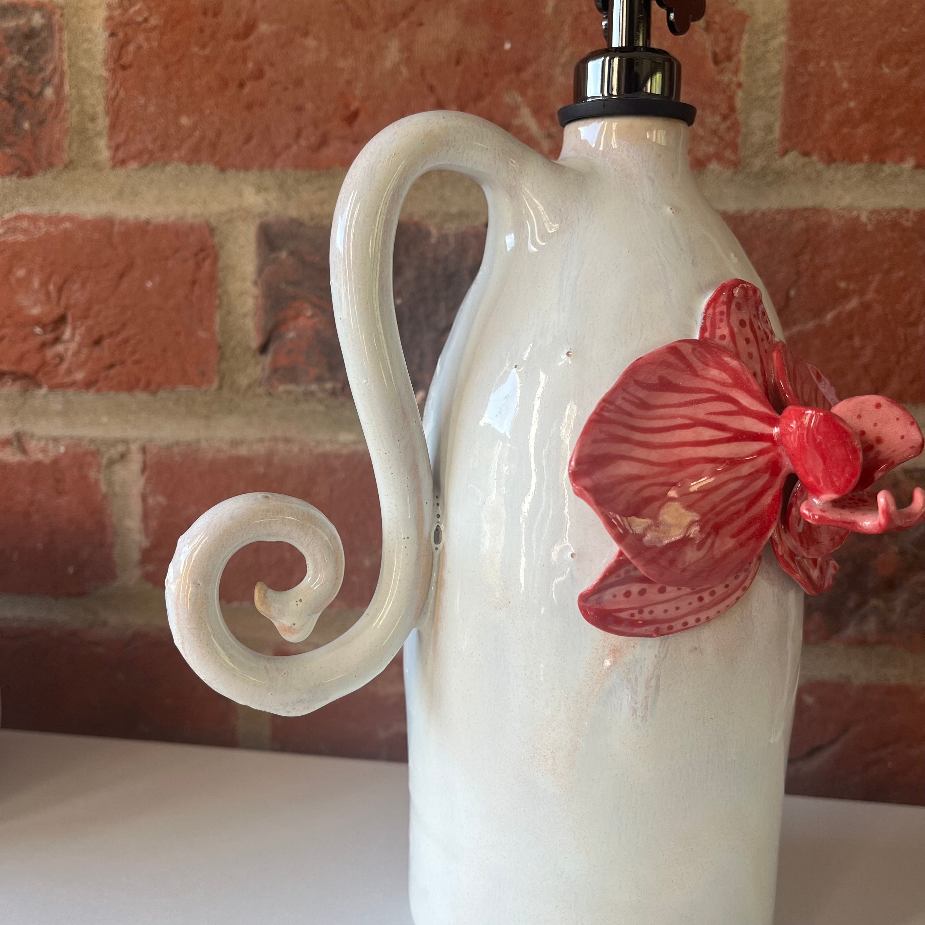 A handmade orchid made by Olivia and placed onto a stoneware oil pourer, also thrown by Olivia.