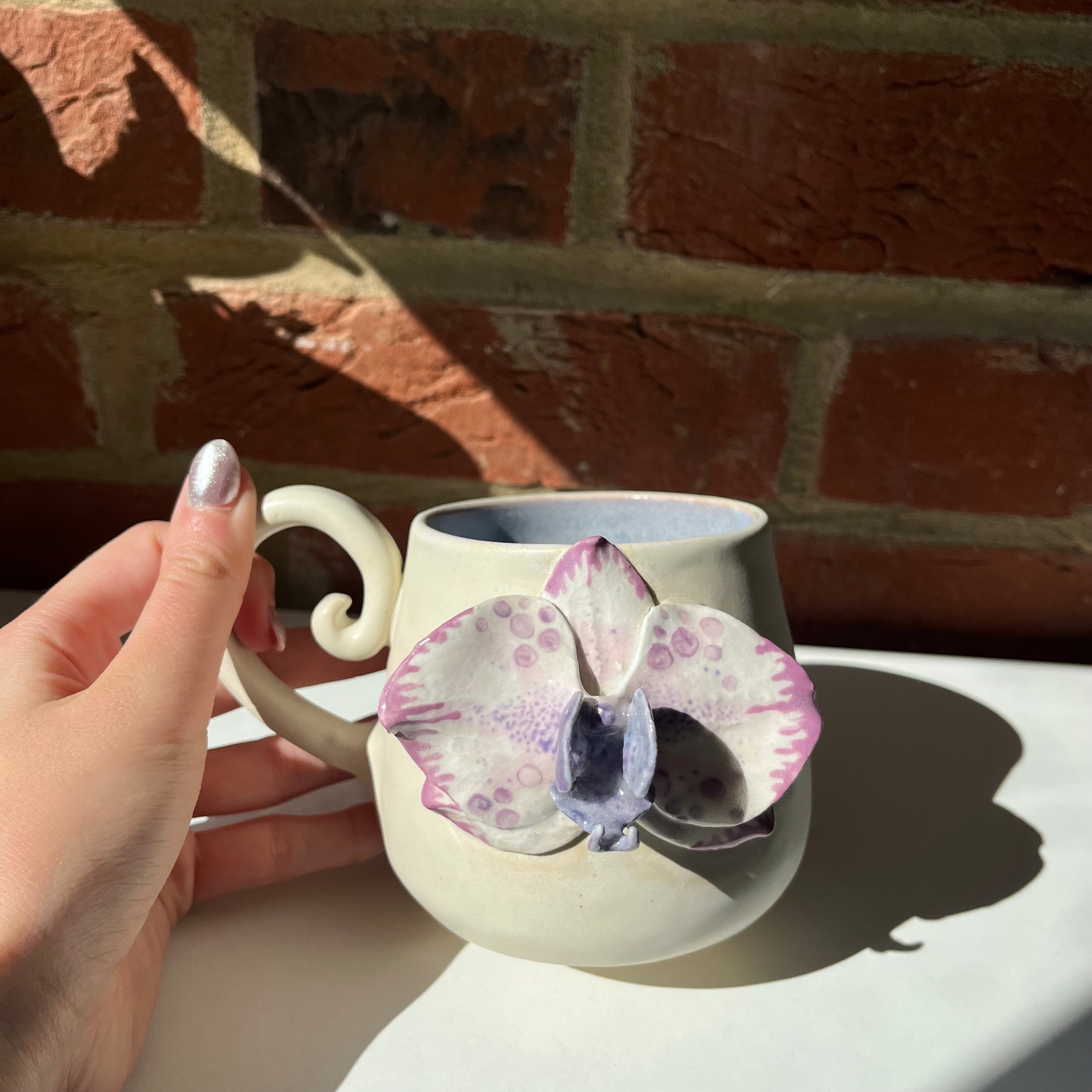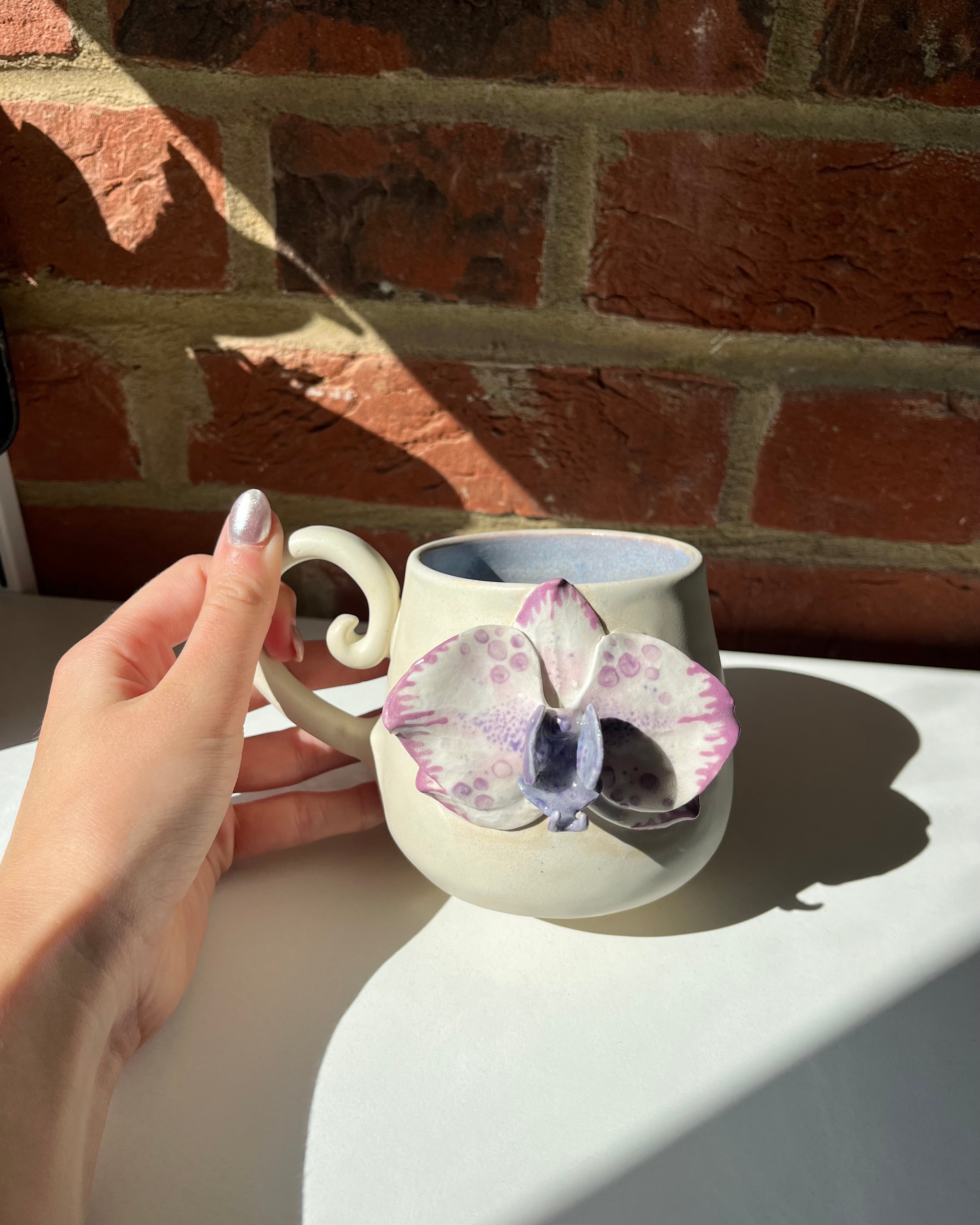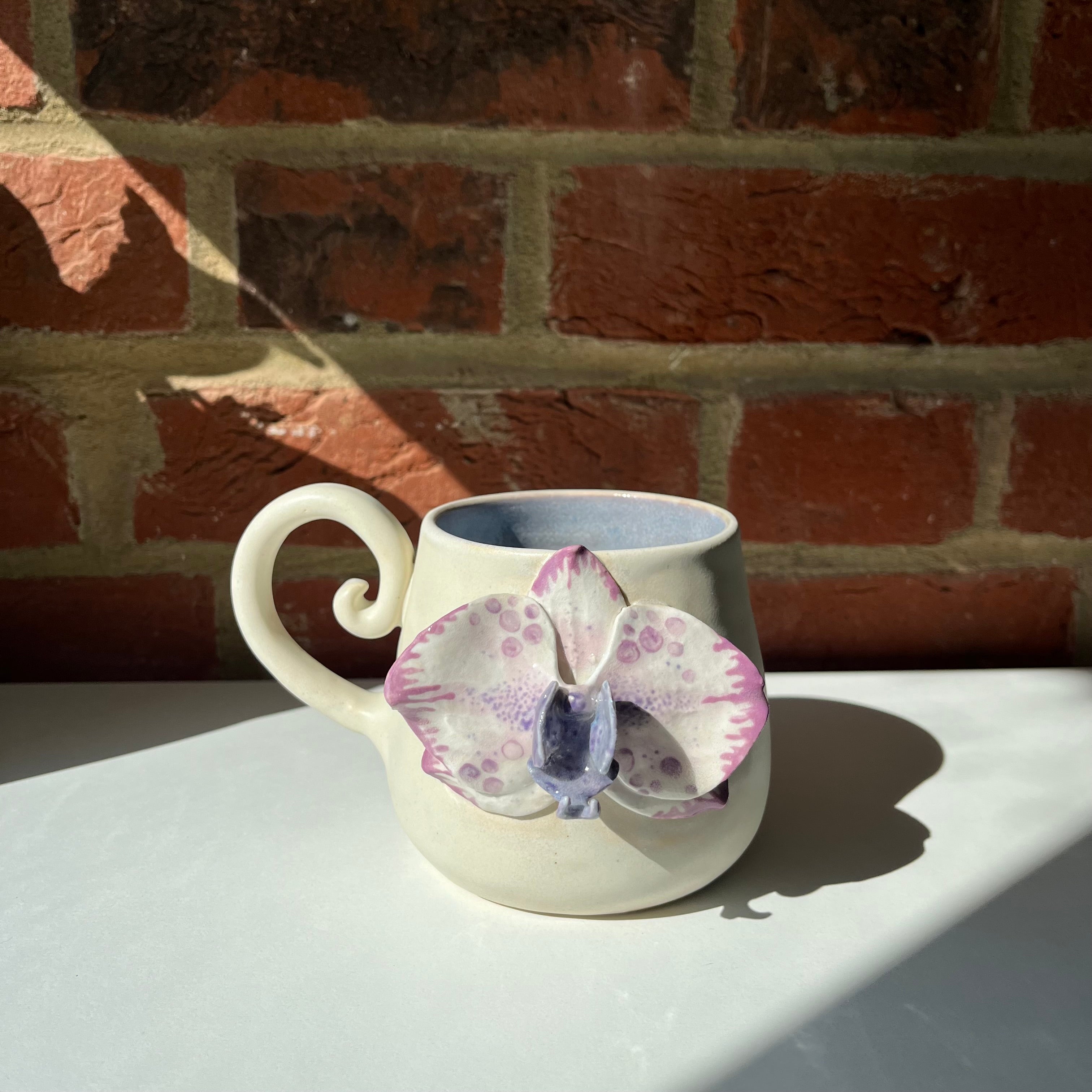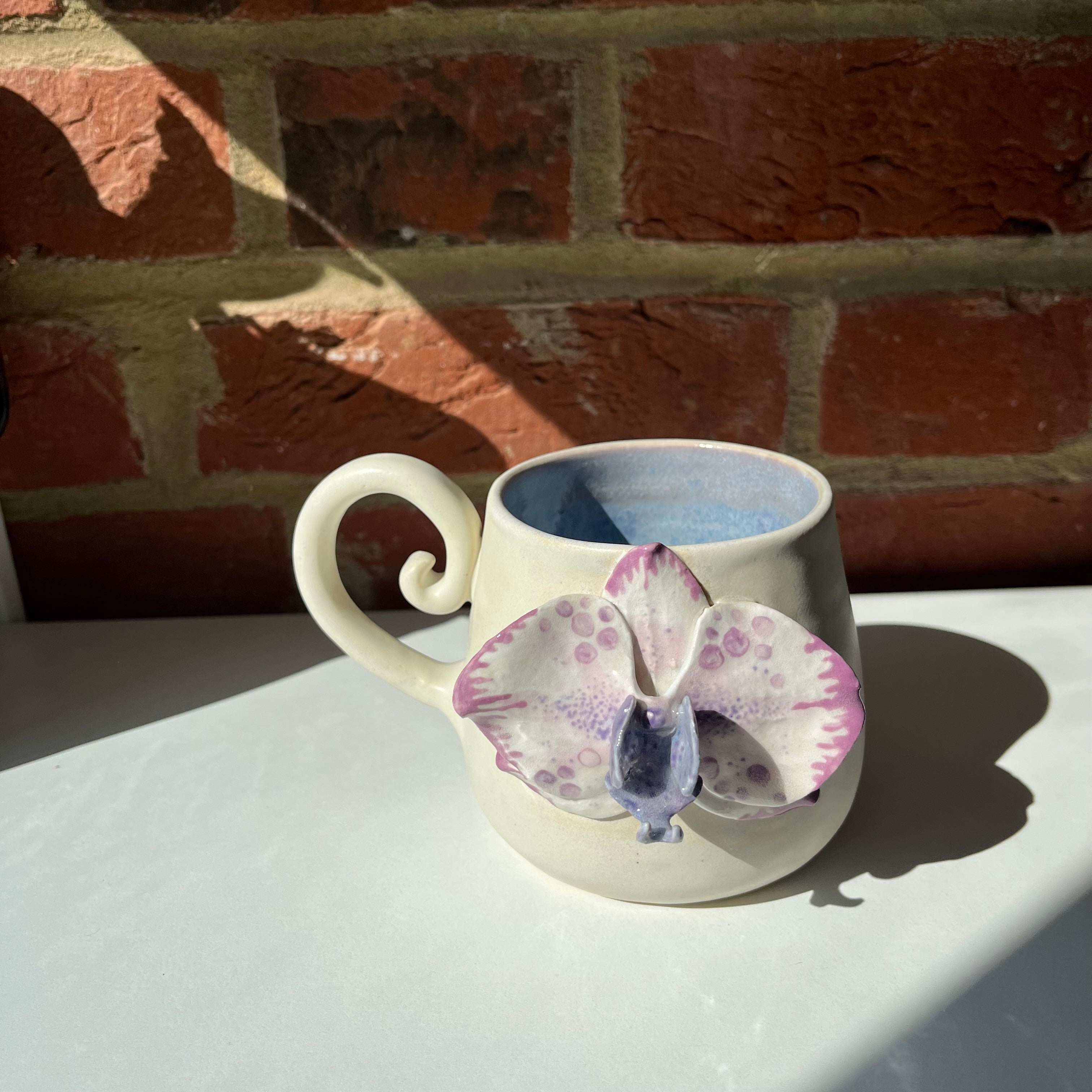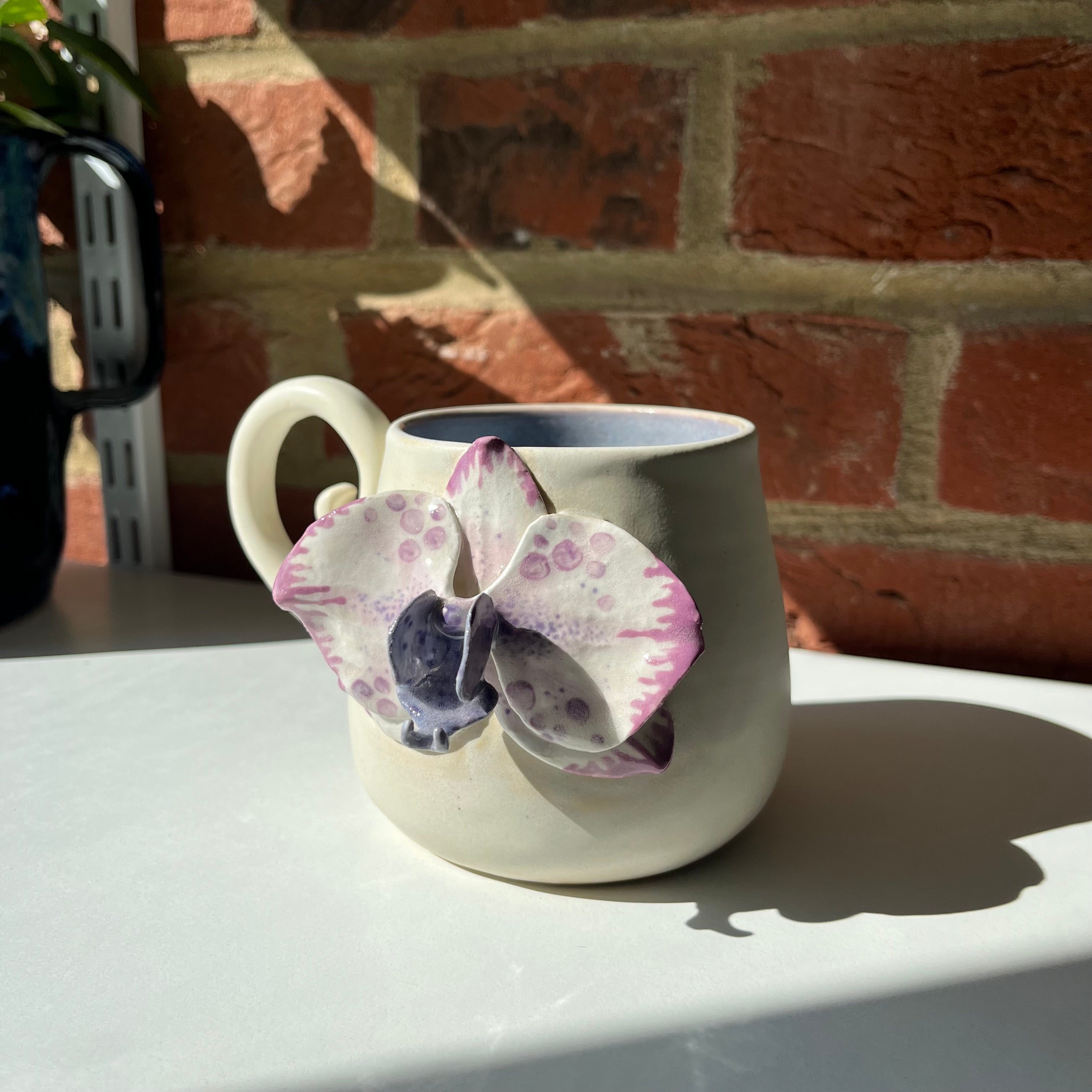 A handmade orchid delicately sculpted onto a stoneware mug thrown and glazed by Olivia