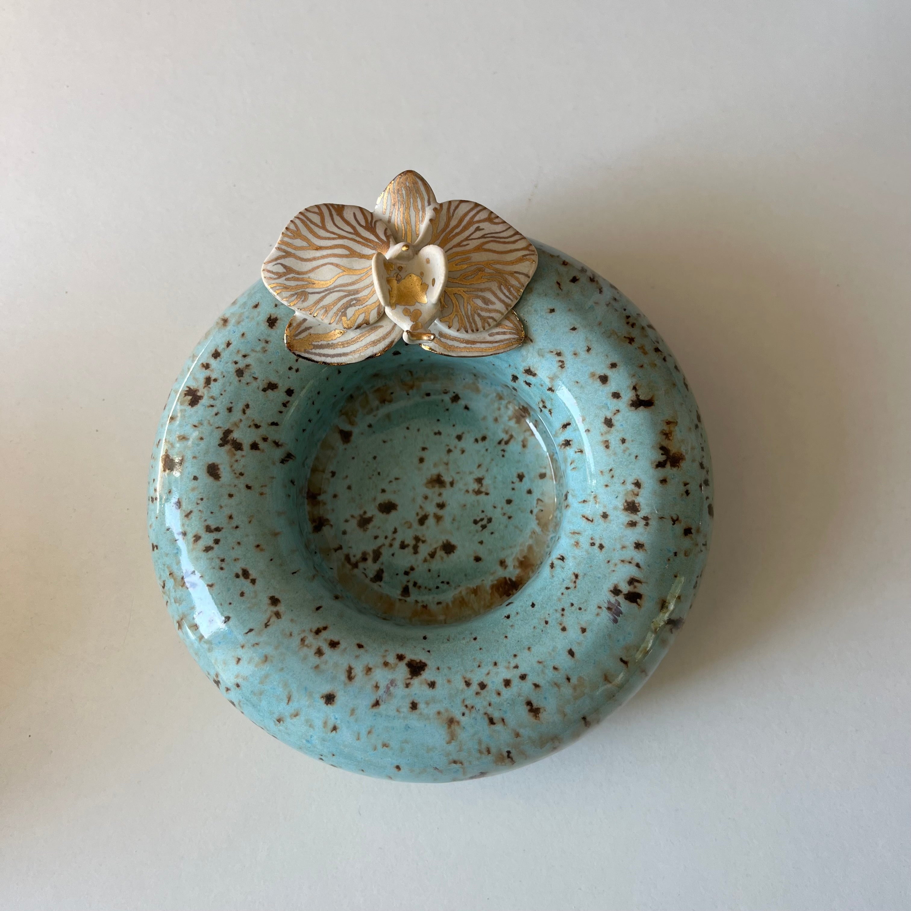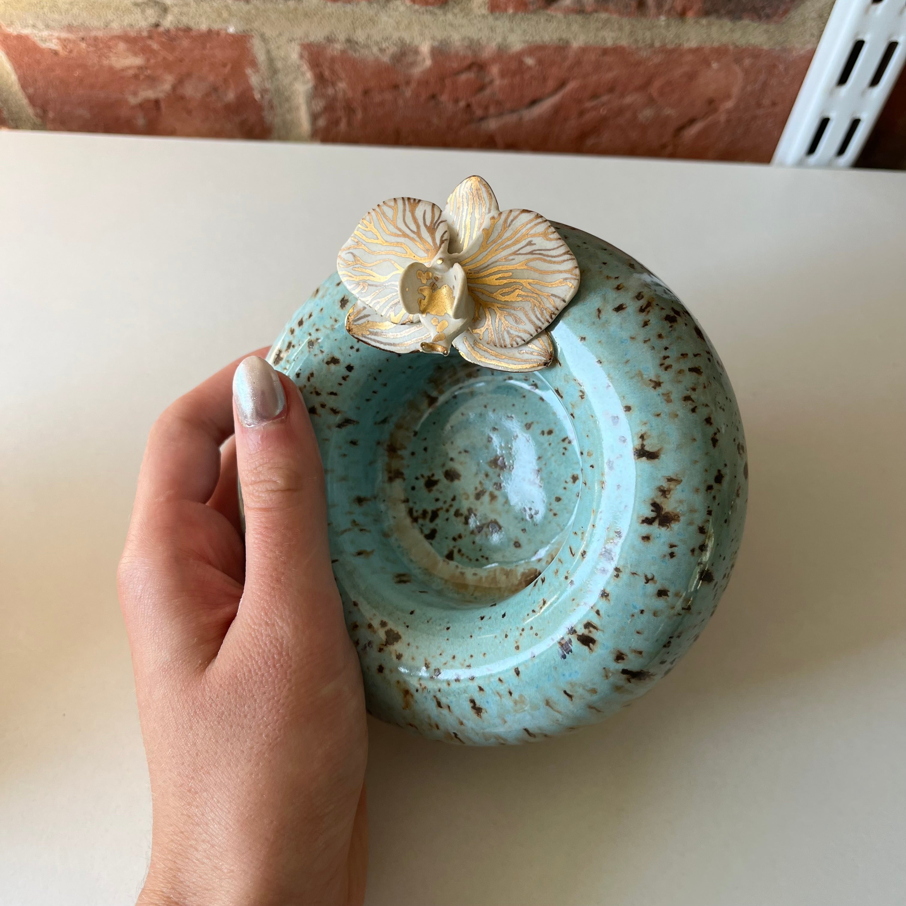 A handmade orchid made by Olivia and placed onto a stoneware dish, also thrown by Olivia.