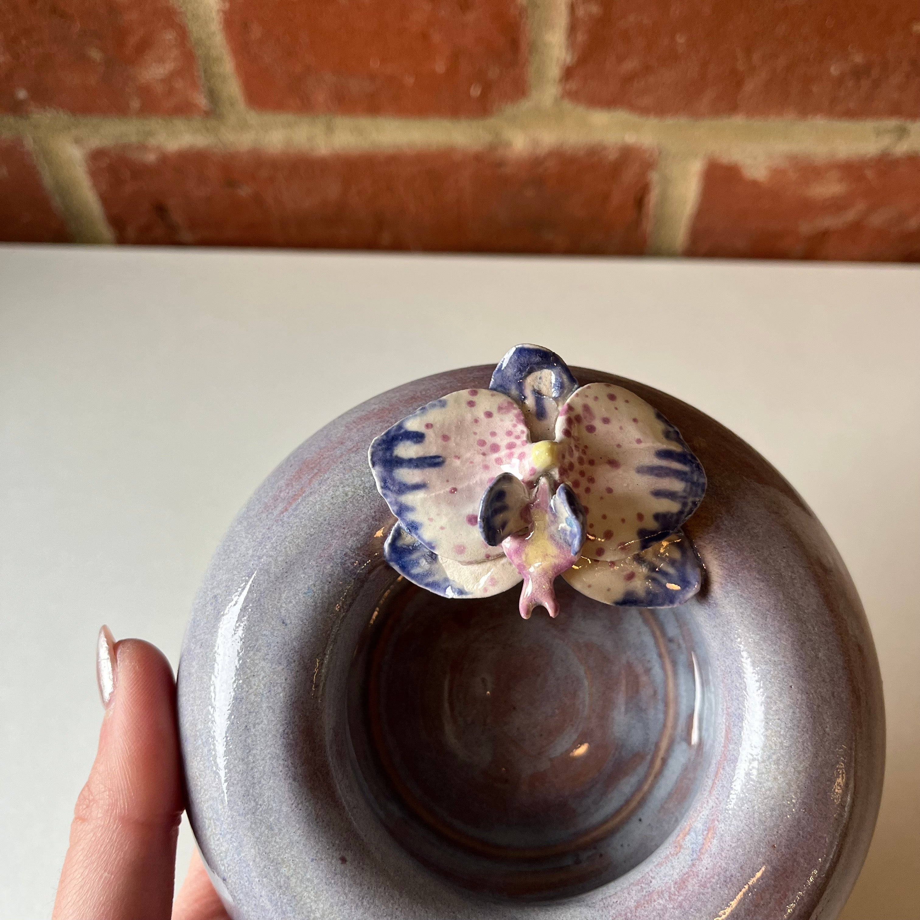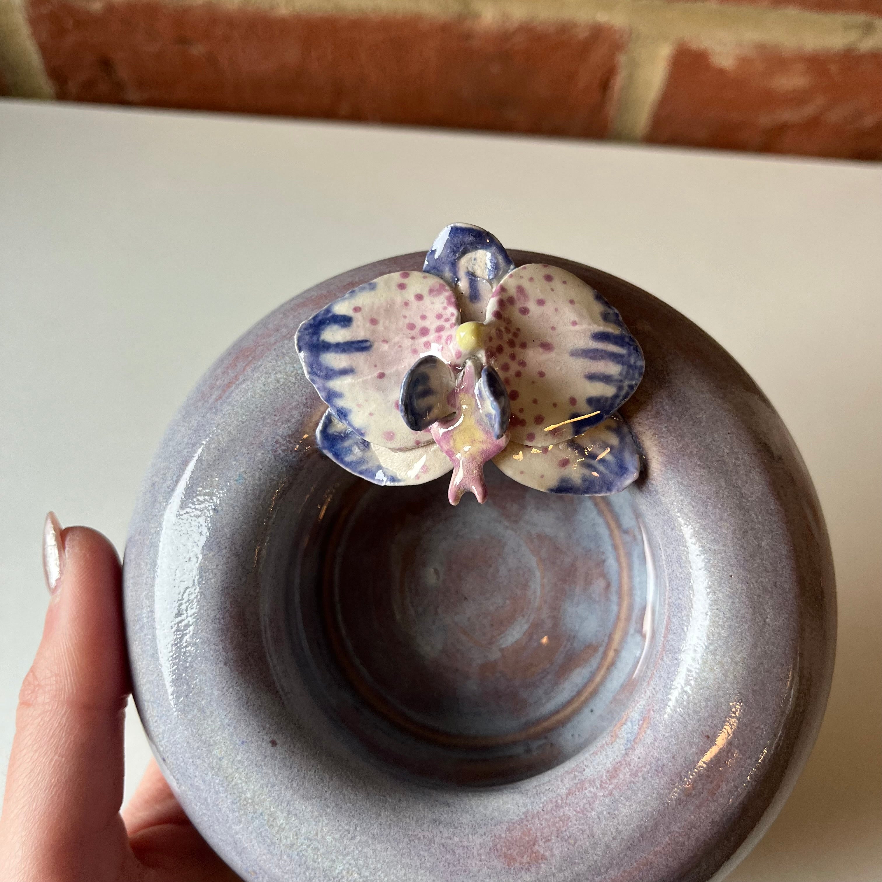 A handmade orchid made by Olivia and placed onto a stoneware dish, also thrown by Olivia.