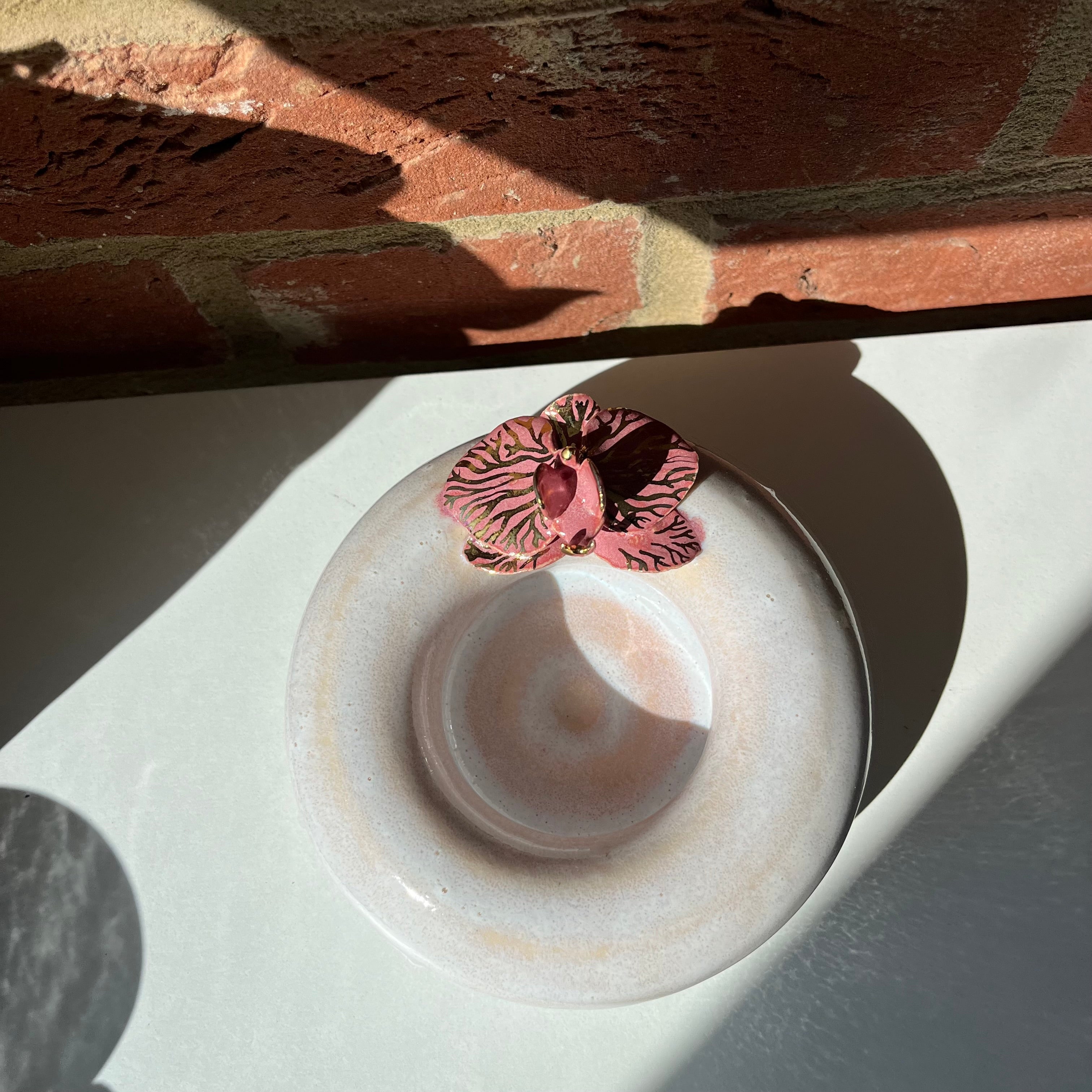 A handmade orchid made by Olivia and placed onto a stoneware dish, also thrown by Olivia.