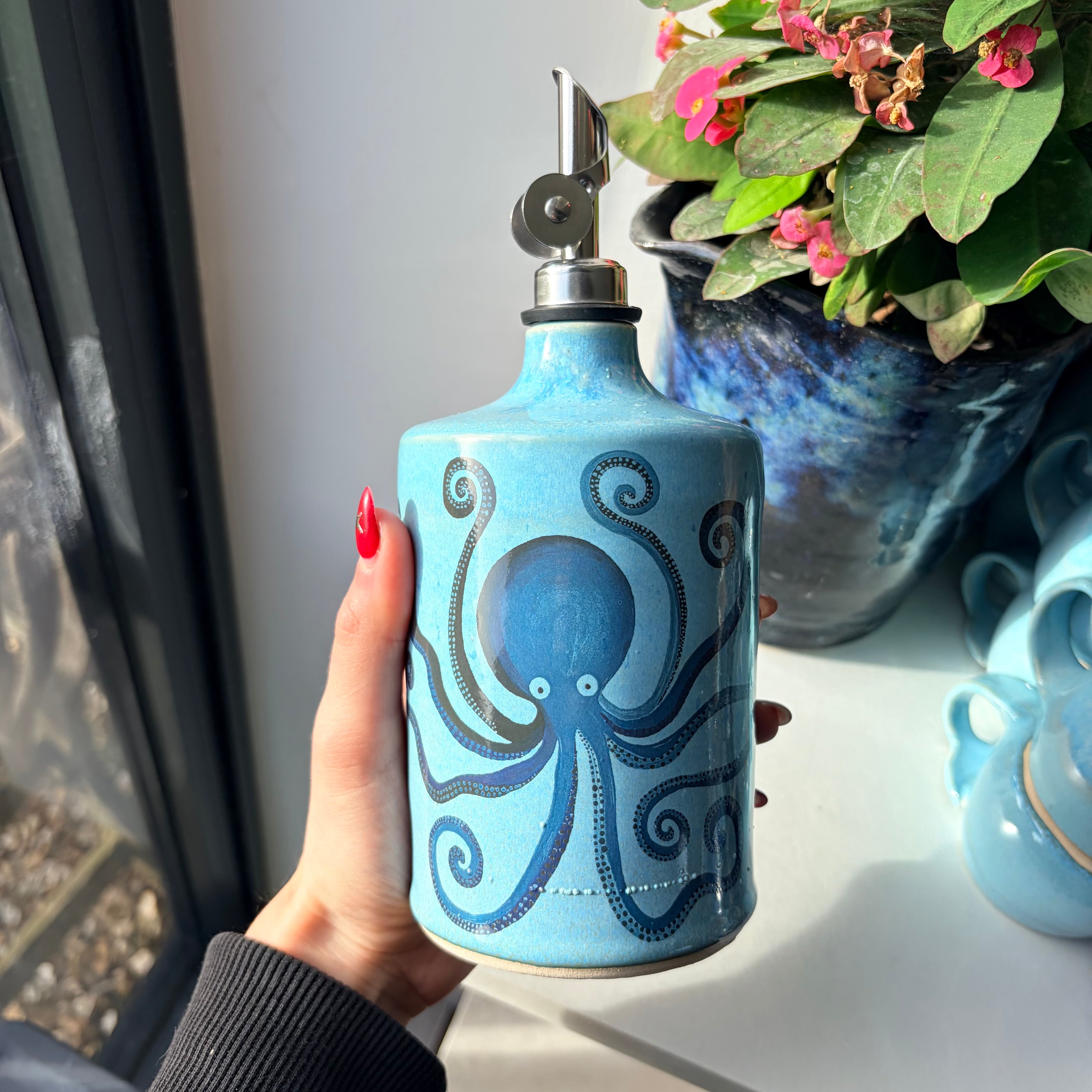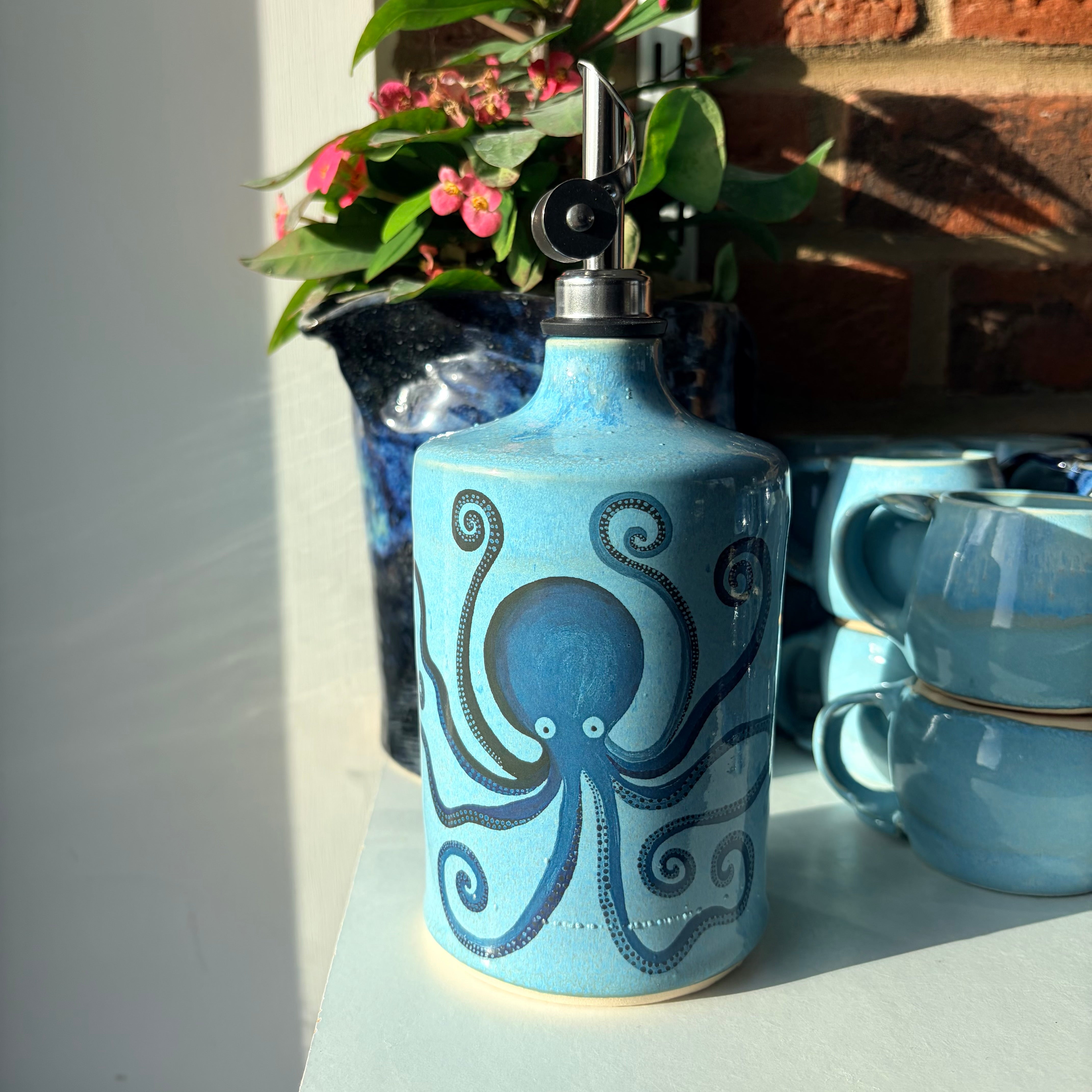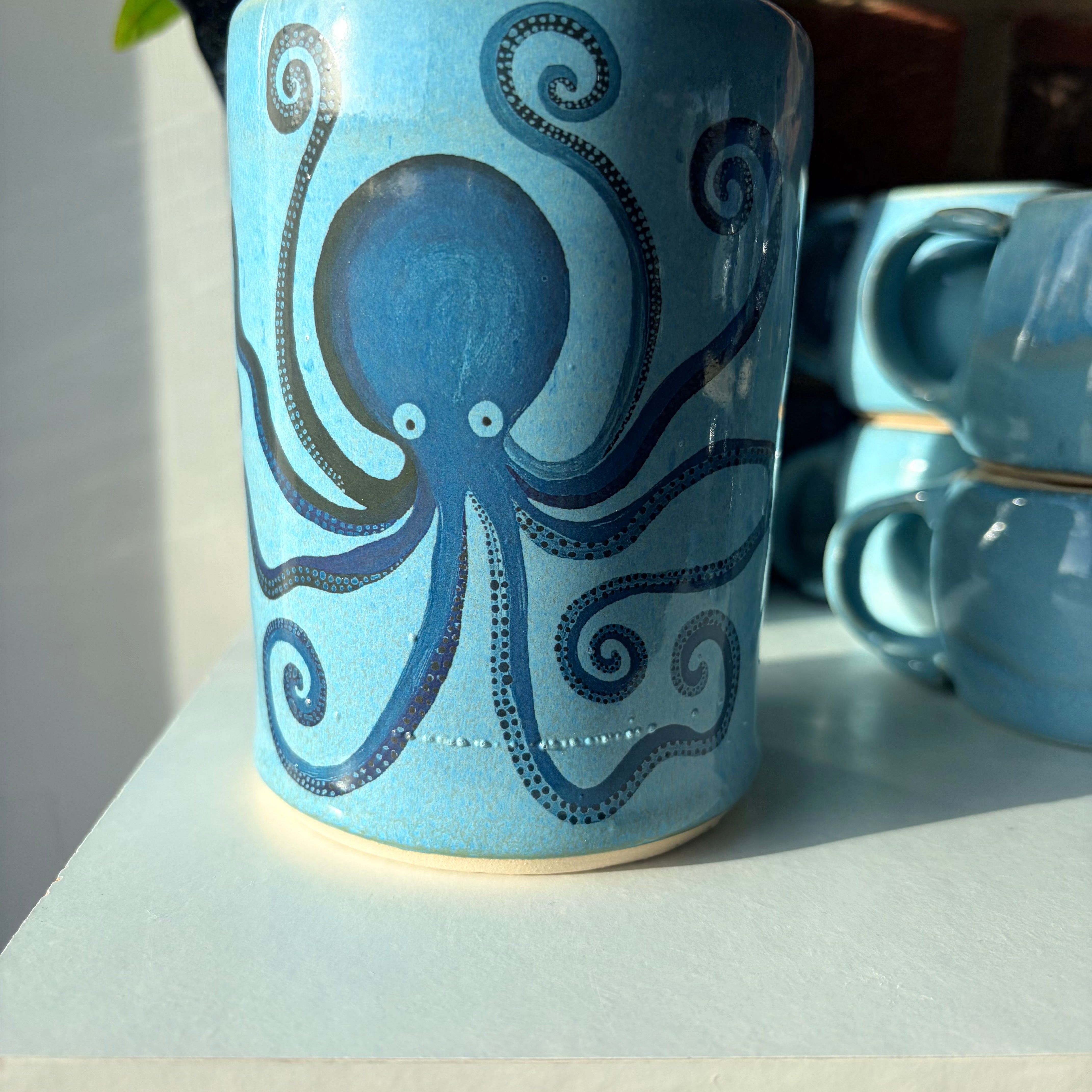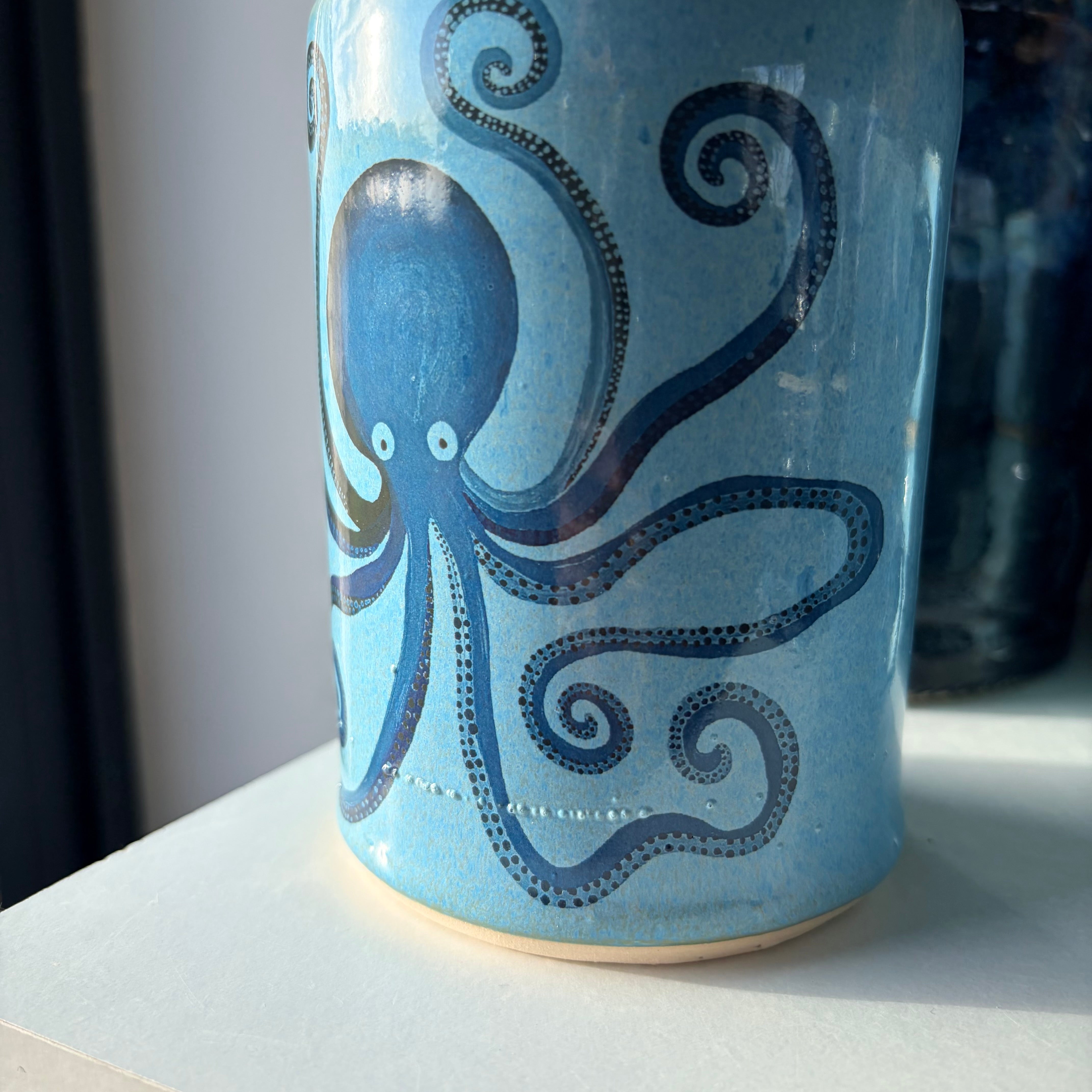 * Thrown on the wheel by Olivia, and a decal of Emily’s mouth painted octopus has been made and transferred onto the vessel.